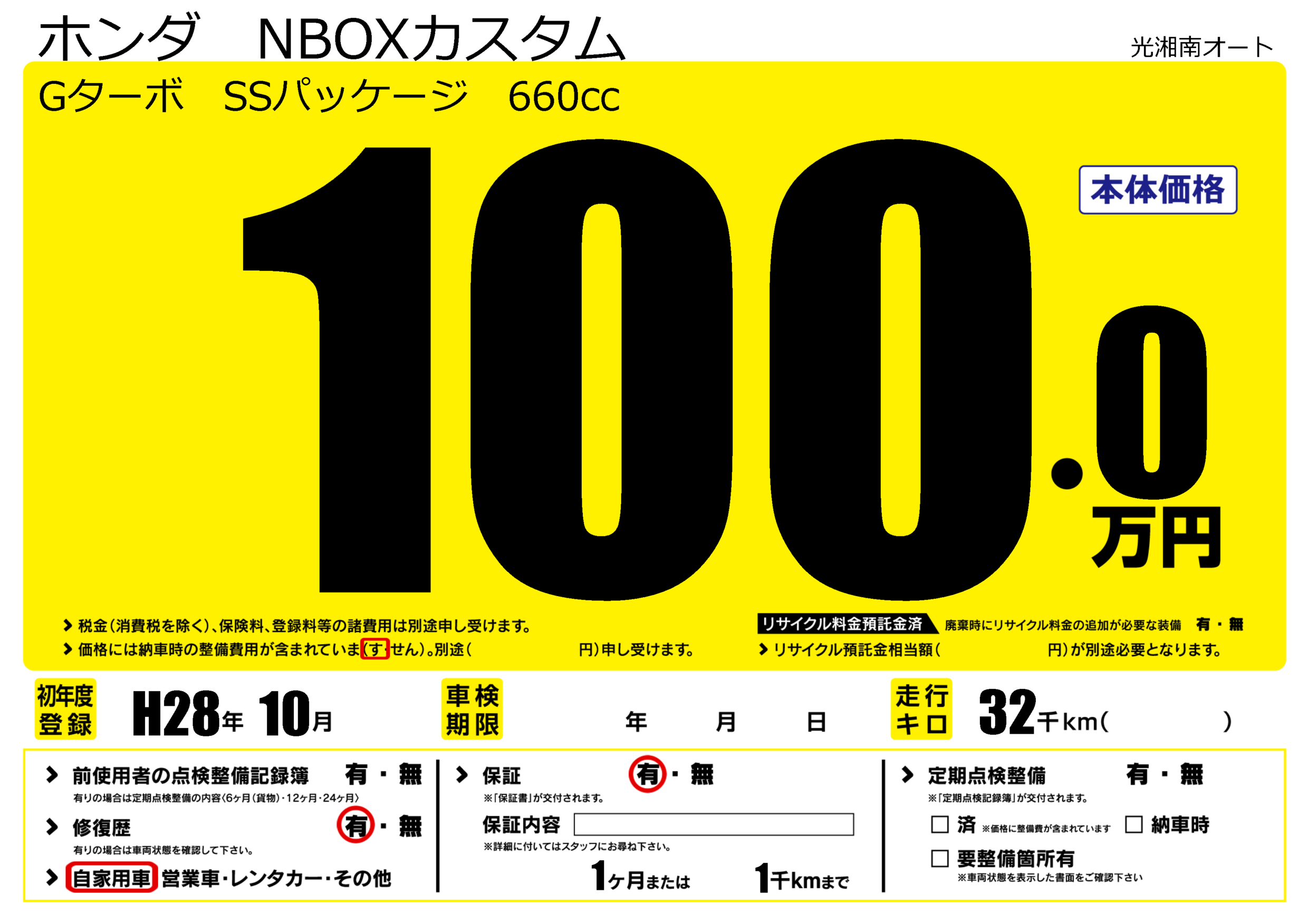 | 車名 | ホンダ NBOXカスタム | グレード ミッション 排気量 |