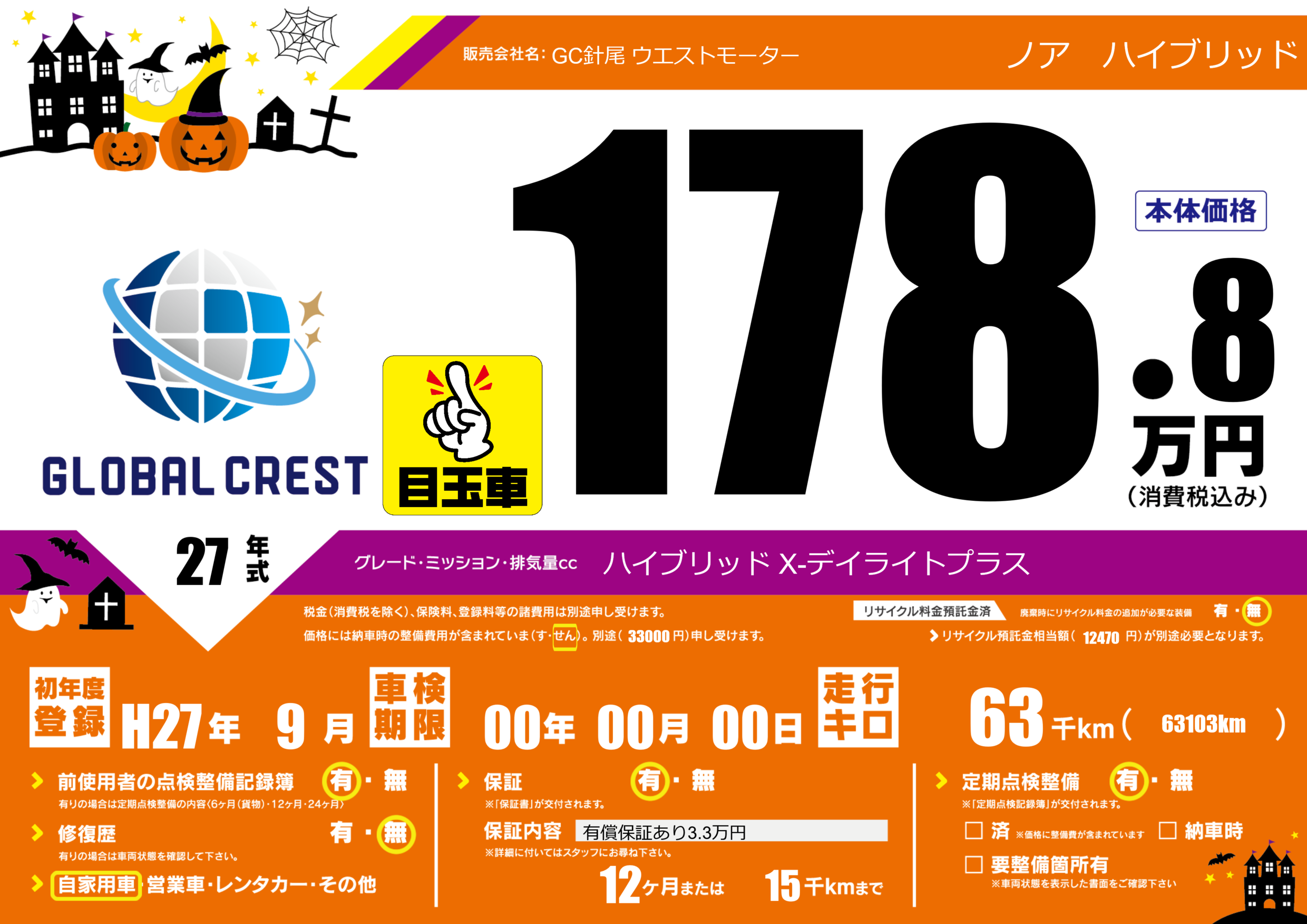 | 走行キロ | 6.3万km | 初年度登録 | H27年9月 |