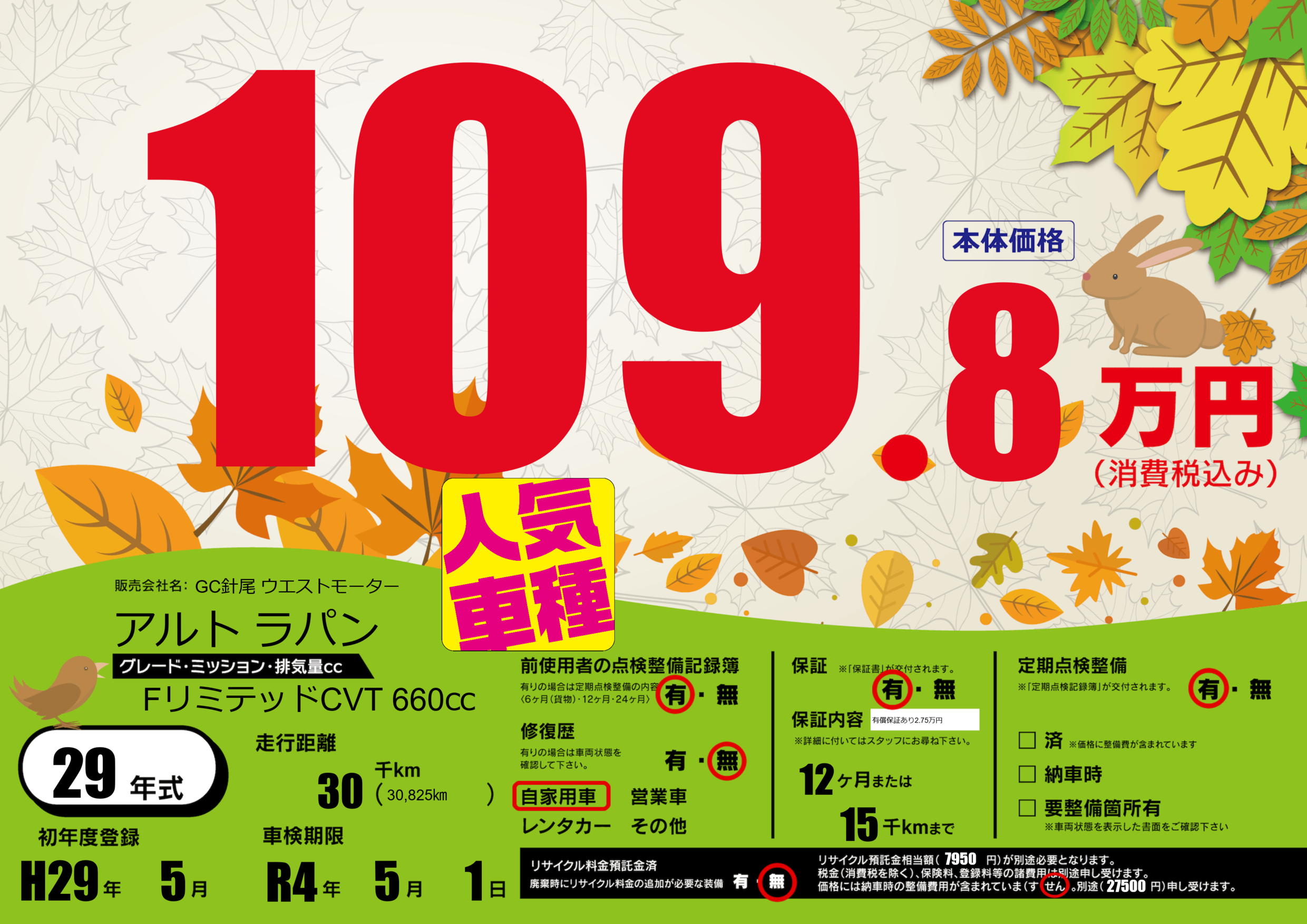 保証付き 保証内容(有償保証あり2.75万円) 12ヶ月または(15)千kmまで |