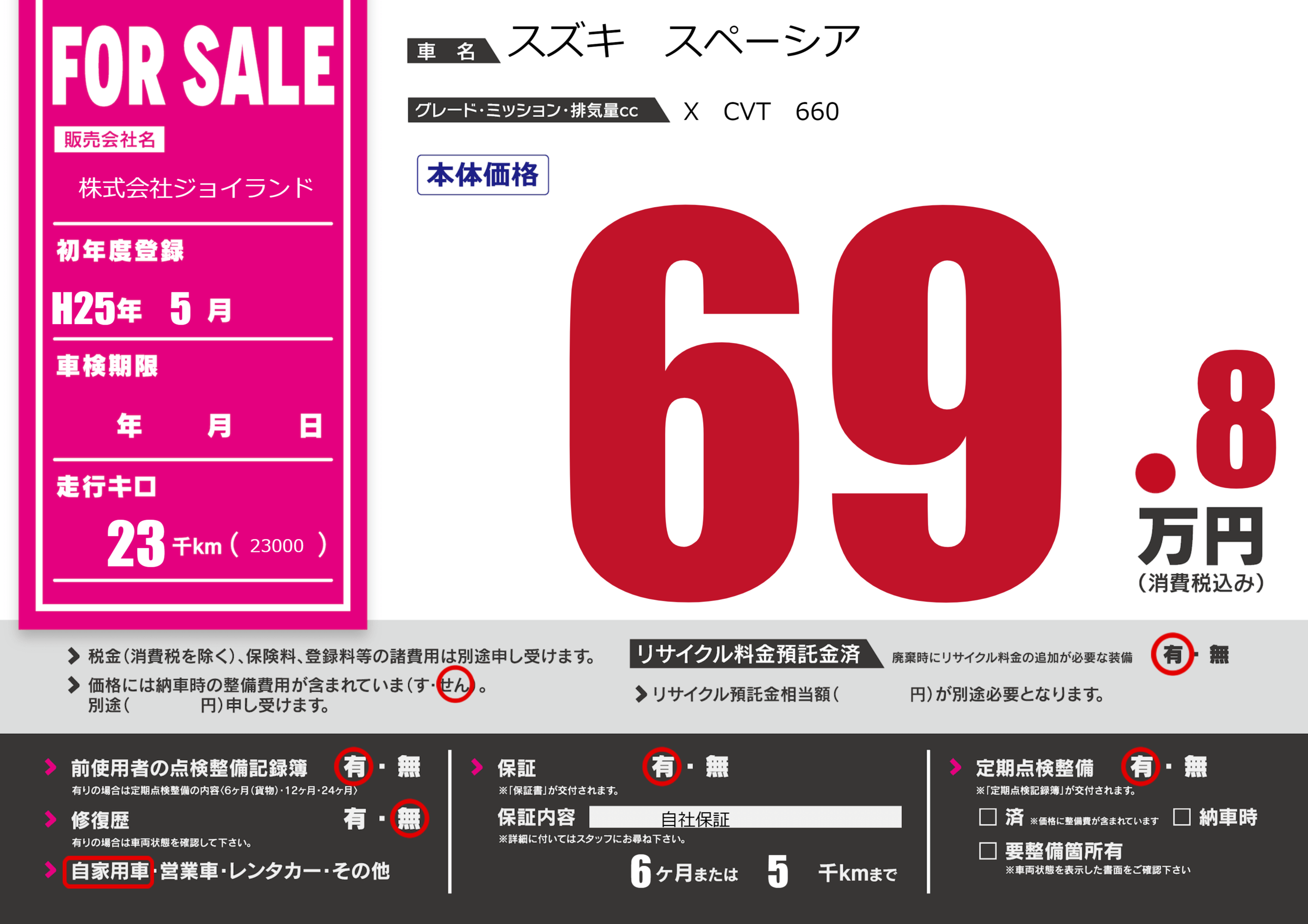 保証付き 保証内容( 自社保証) 6ヶ月または(5)千kmまで |