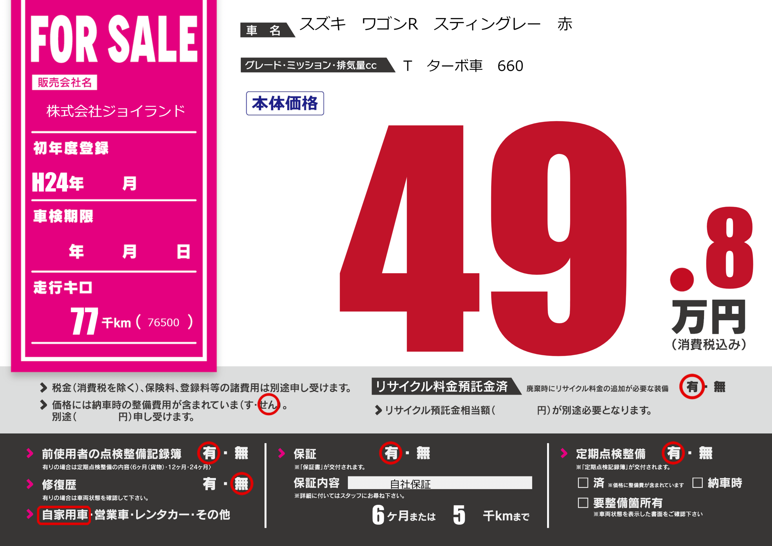 | 車名 | スズキ ワゴンR スティングレー 赤 | グレード ミッション 排気量 |