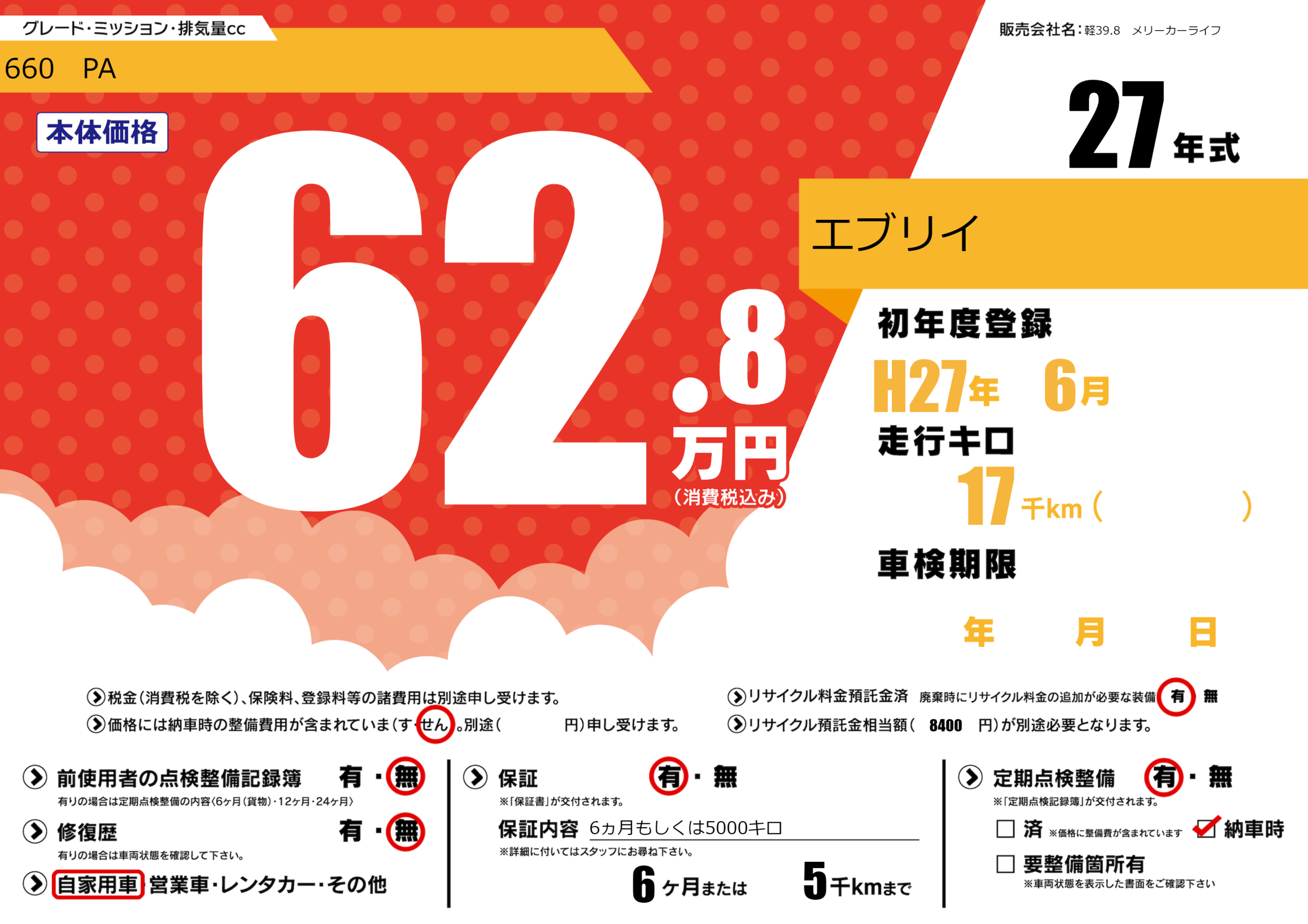 | 車名 | エブリイ | グレード ミッション 排気量 |