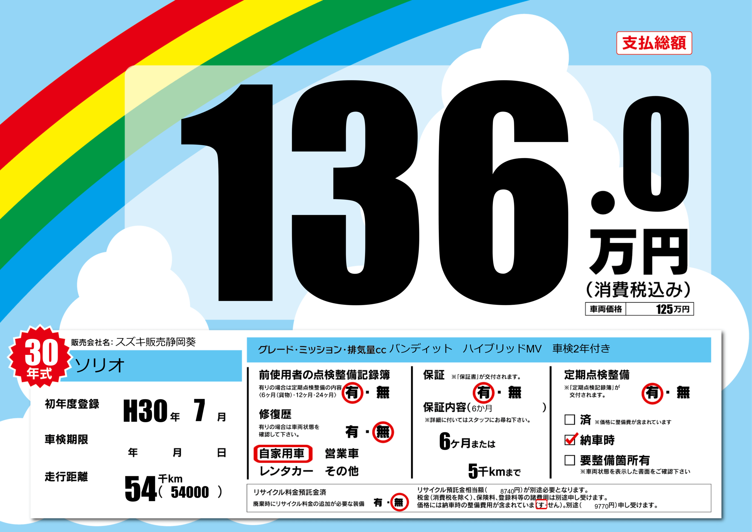| 走行キロ | 5.4万km | 初年度登録 | H30年7月 |