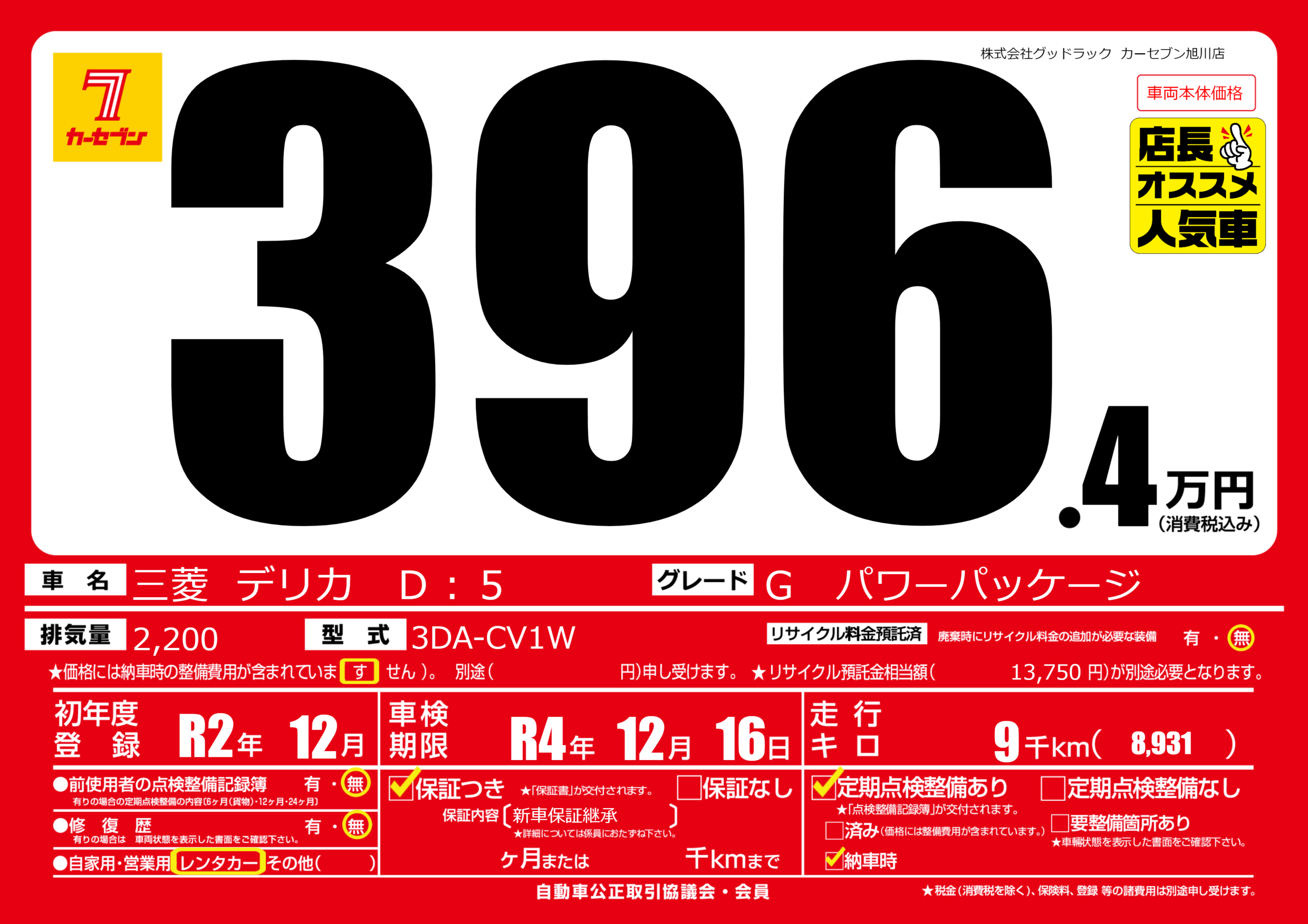 | 車名 | 三菱 デリカ D:5 | グレード ミッション 排気量 |