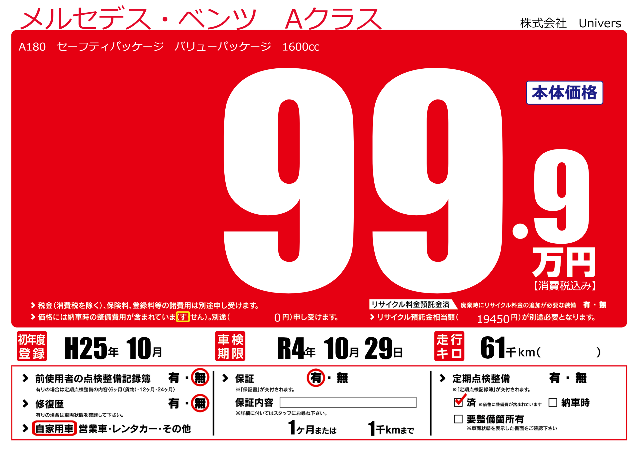 | 車名 | メルセデス・ベンツ Aクラス | グレード ミッション 排気量 |