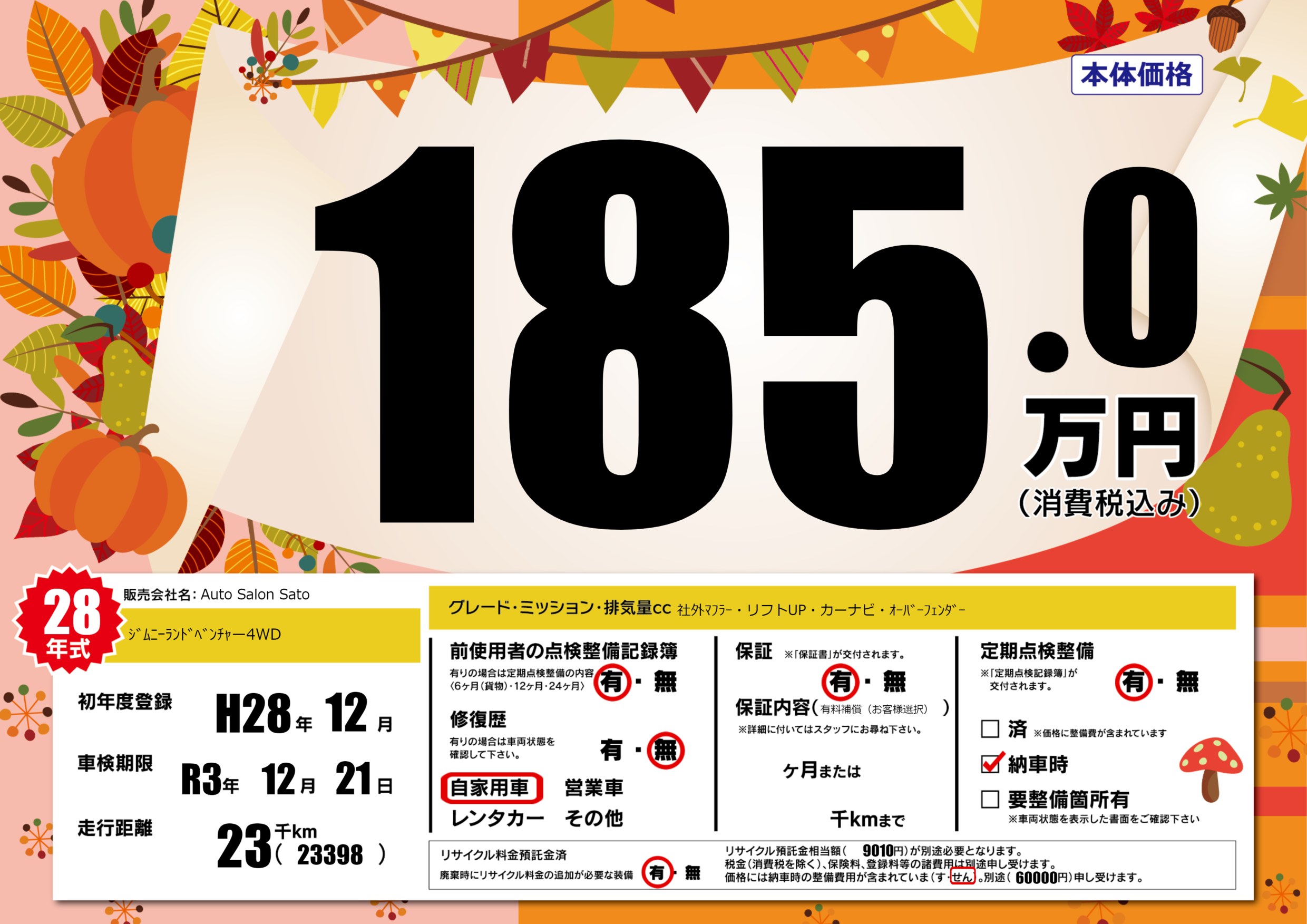 | 走行キロ | 2.3万km | 初年度登録 | H28年12月 |