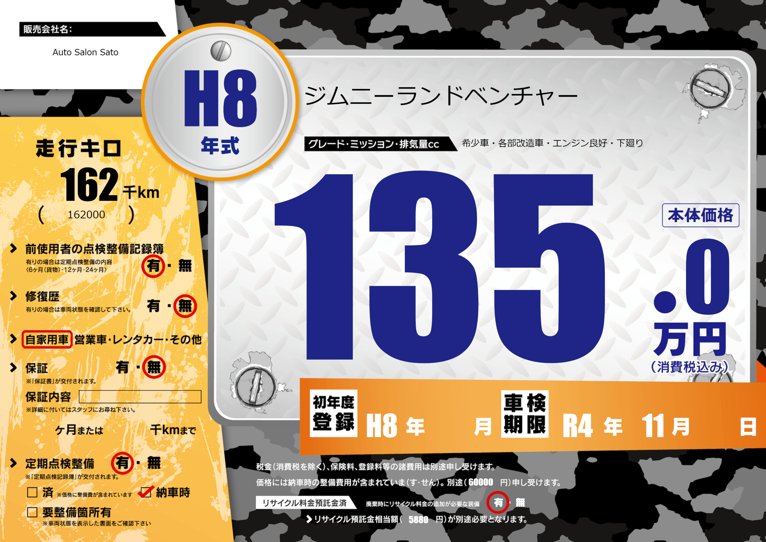 | 走行キロ | 16.2万km | 初年度登録 | H8年---月 |