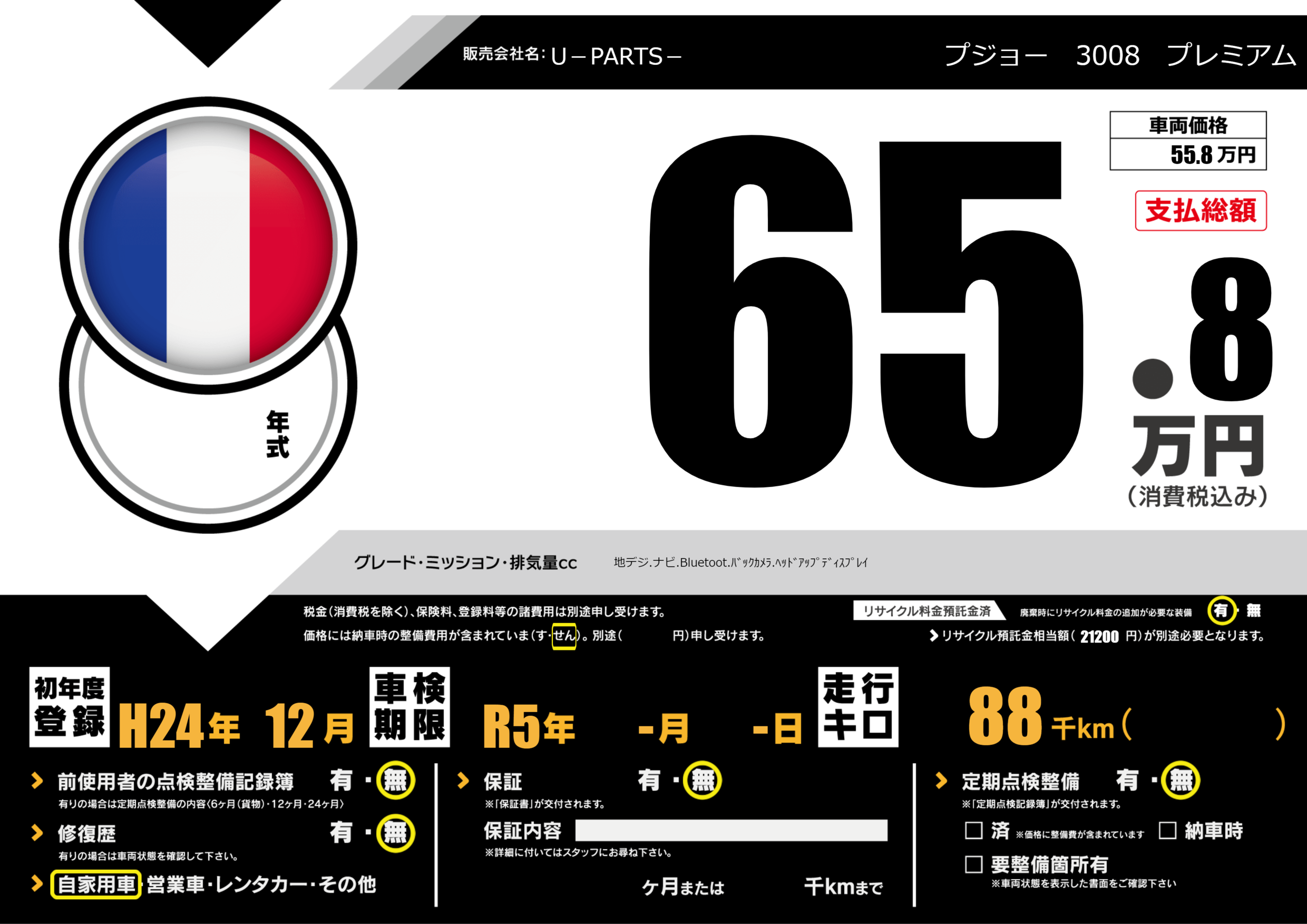 | 車名 | プジョー 3008 プレミアム | グレード ミッション 排気量 |
