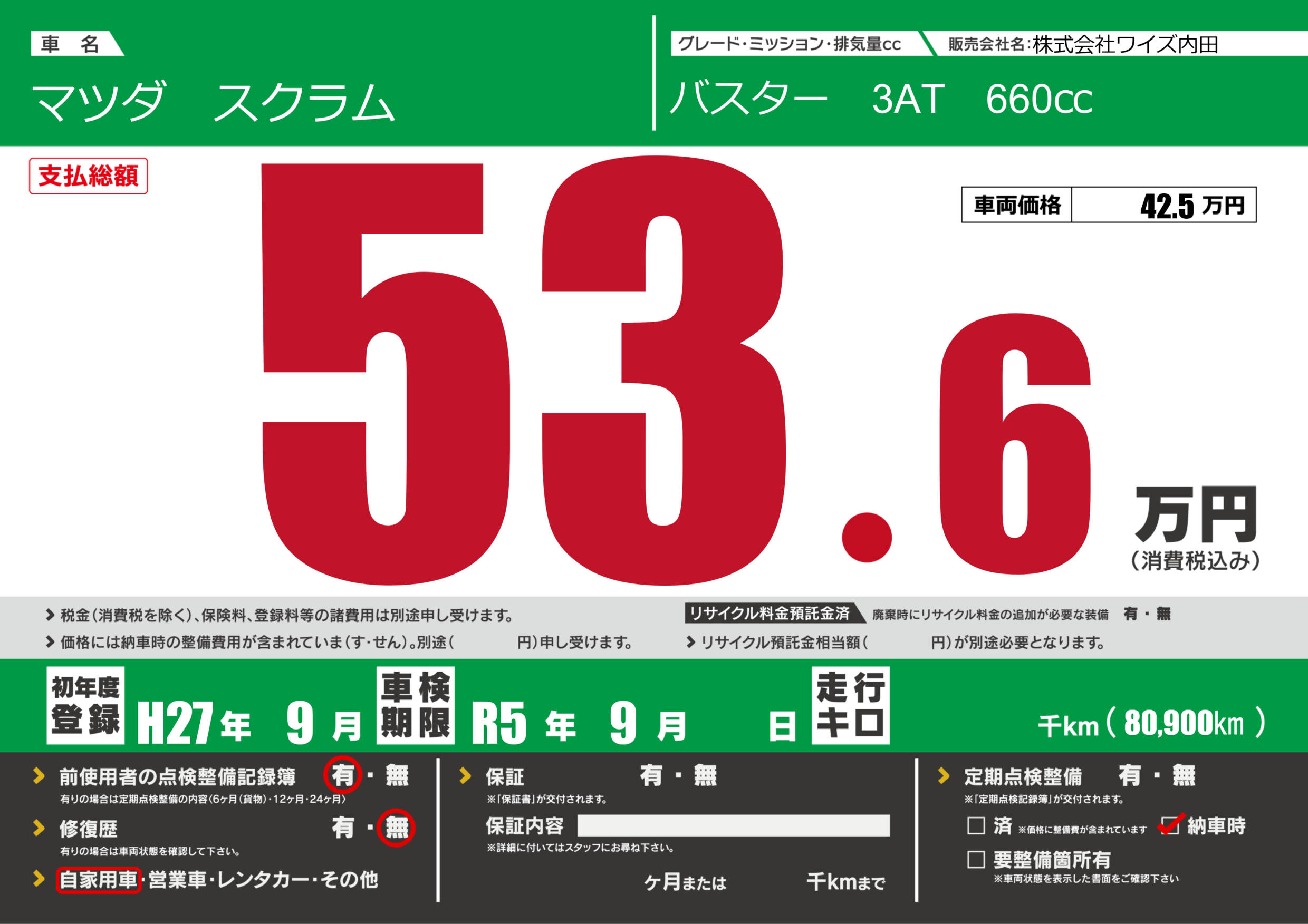 | 走行キロ | - | 初年度登録 | H27年9月 |