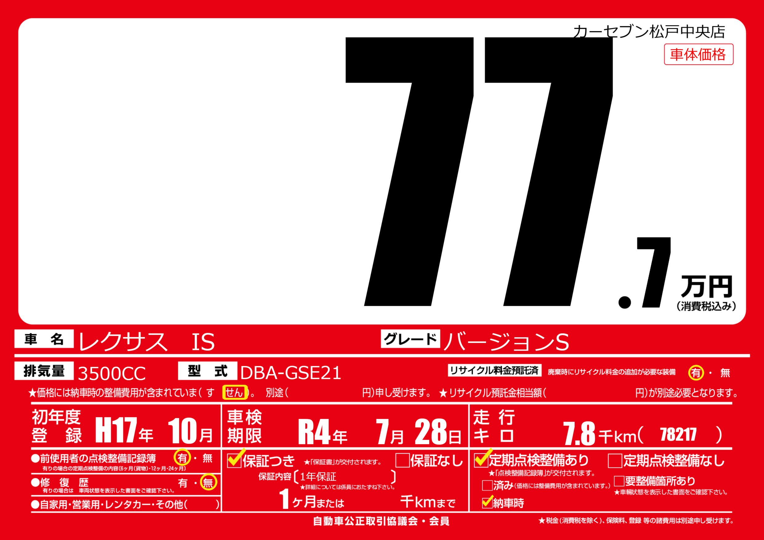 | 車名 | レクサス IS | グレード ミッション 排気量 |