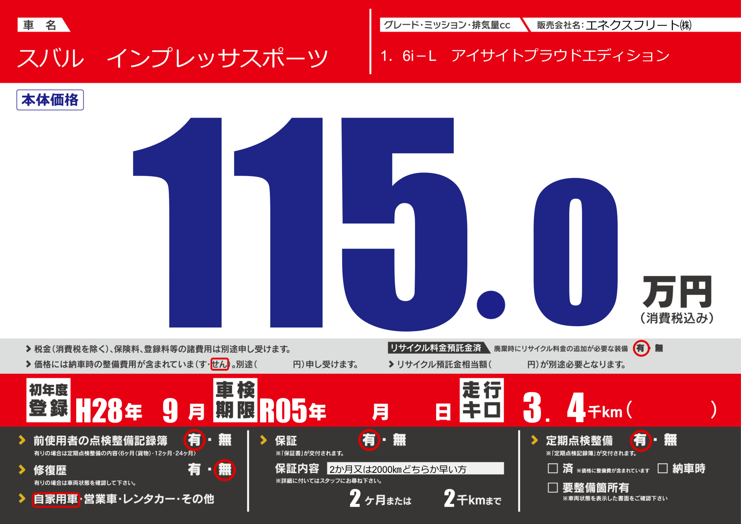 | 車検制限 | R05年 - 月 - 日 | ||
