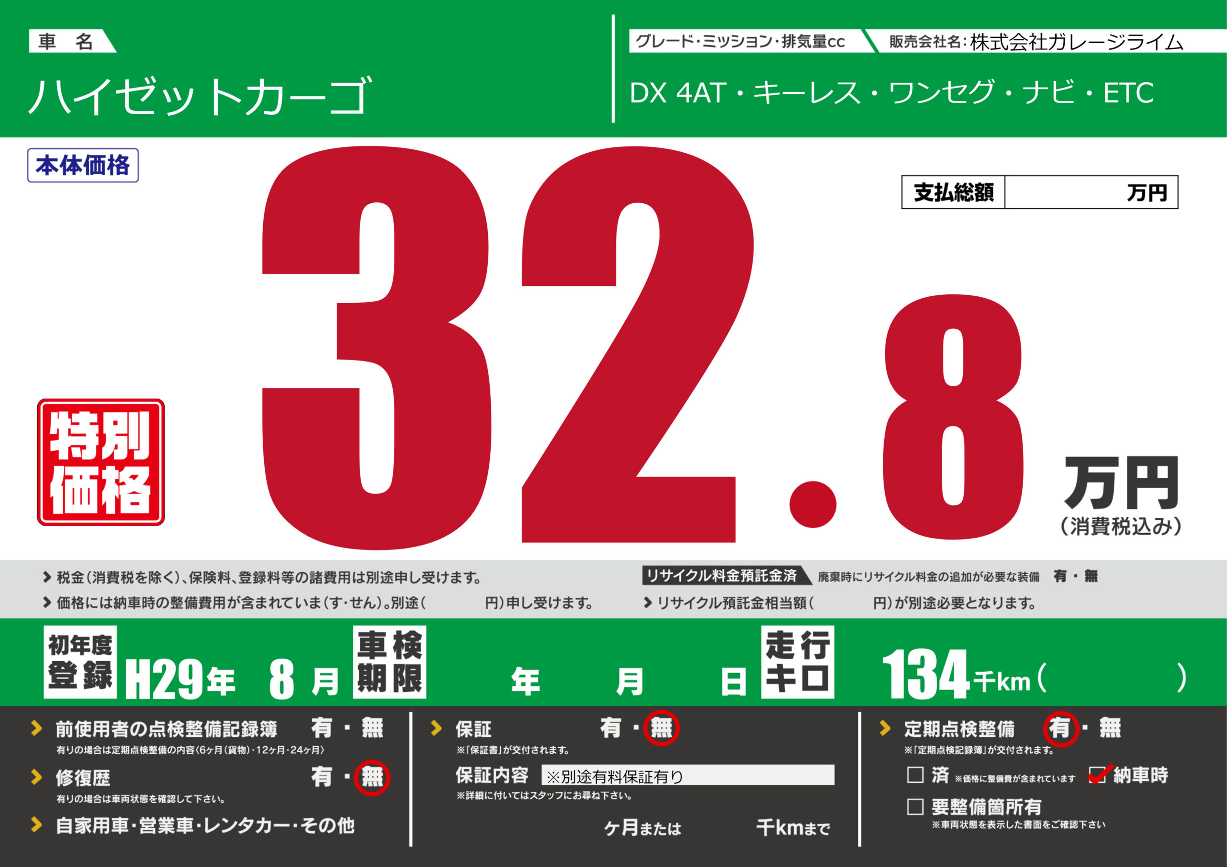 | 定期点検整備 | 定期点検整備あり 納車時あり | ||