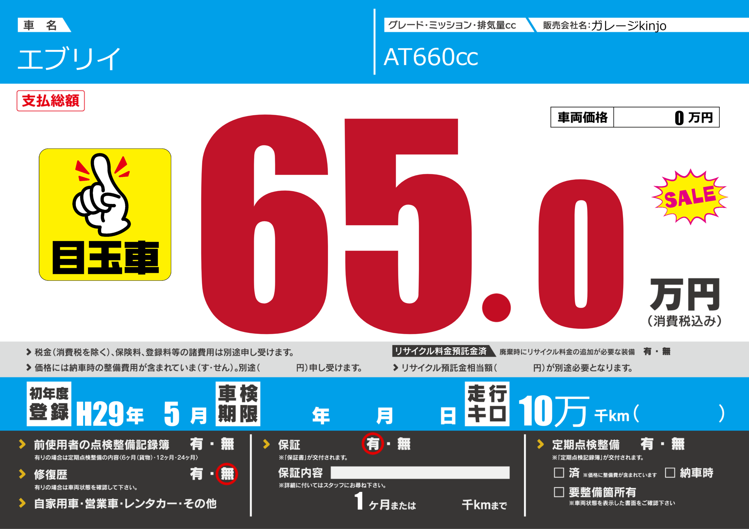保証付き 保証内容(---) 1ヶ月または()千kmまで |