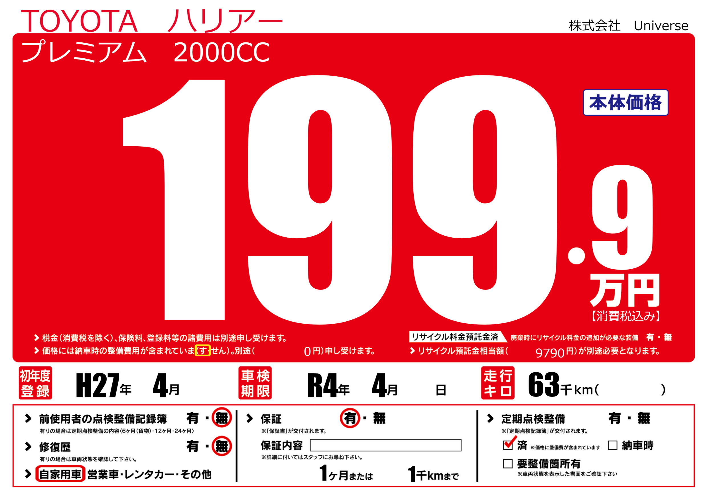 | 車名 | TOYOTA ハリアー | グレード ミッション 排気量 |