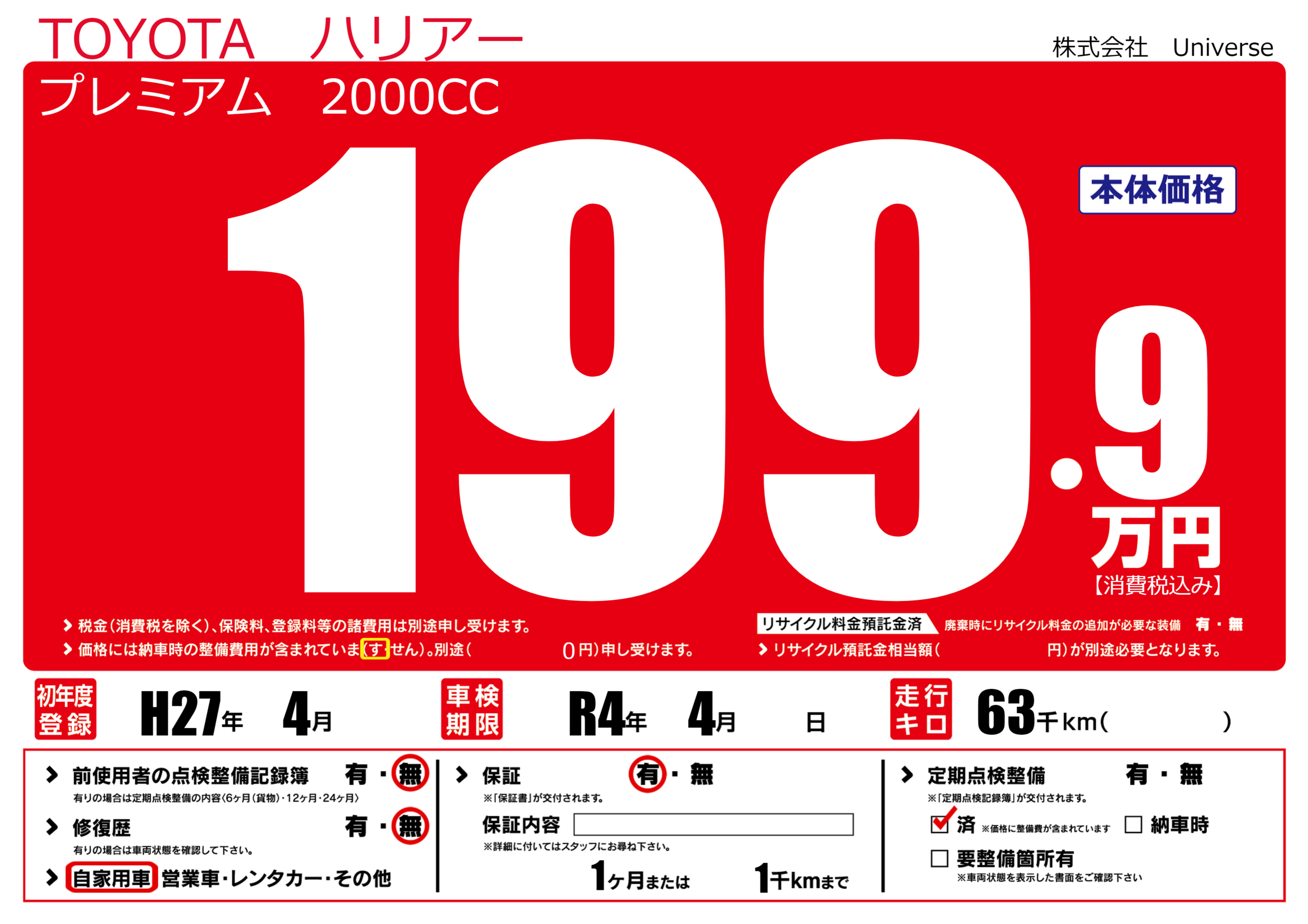 | 車名 | TOYOTA ハリアー | グレード ミッション 排気量 |