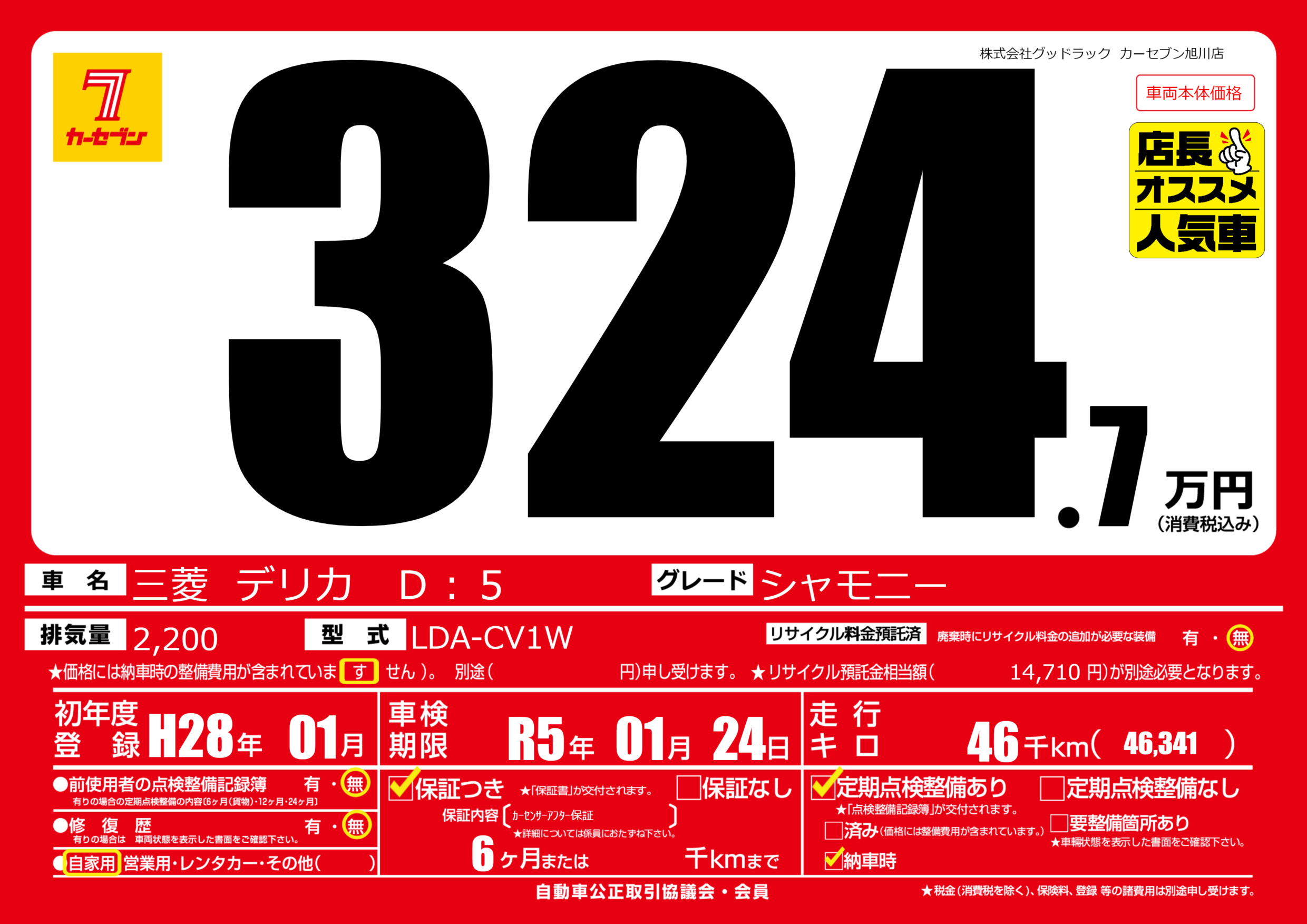 | 車名 | 三菱 デリカ D:5 | グレード ミッション 排気量 |