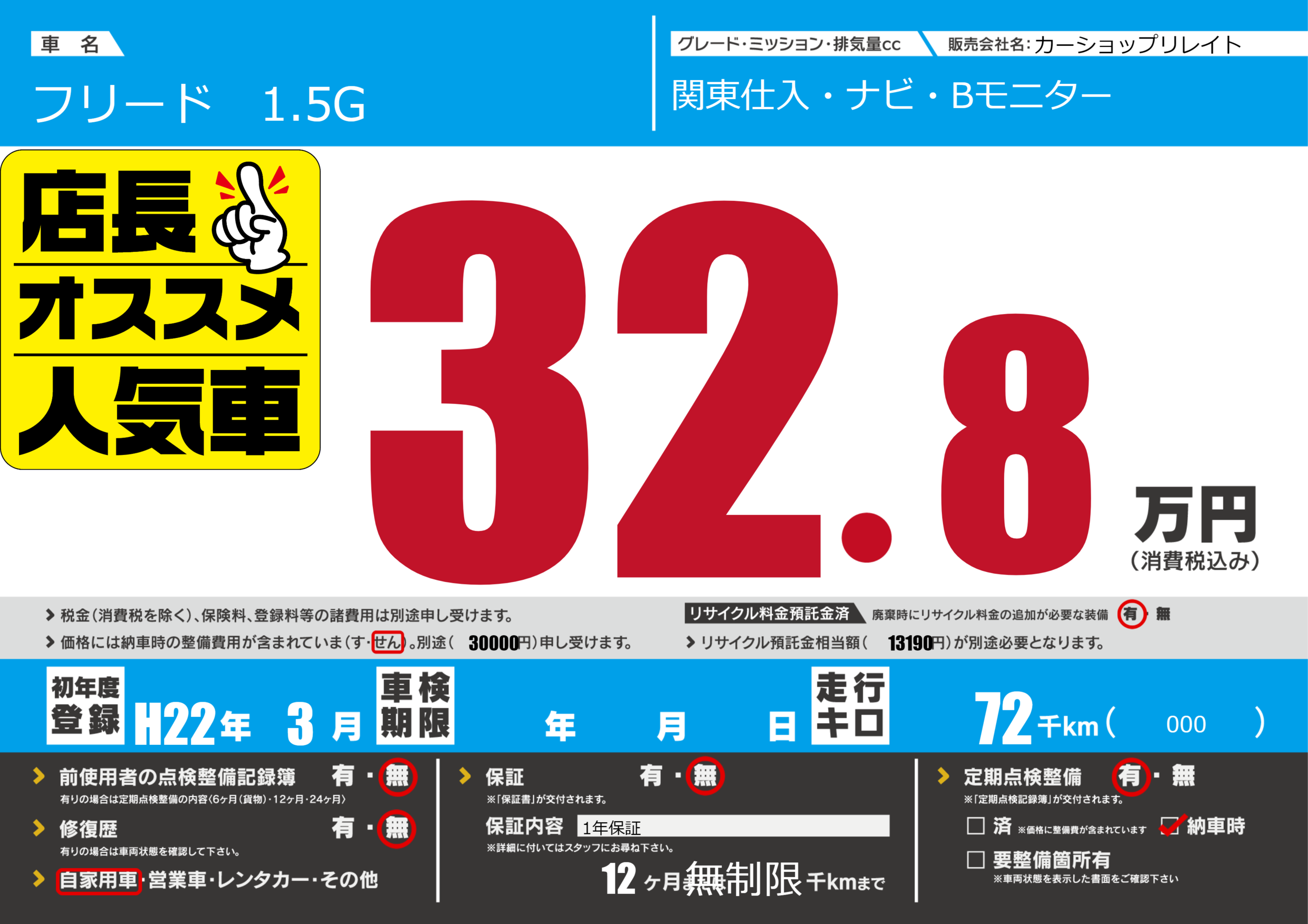| 走行キロ | 7.2万km | 初年度登録 | H22年3月 |