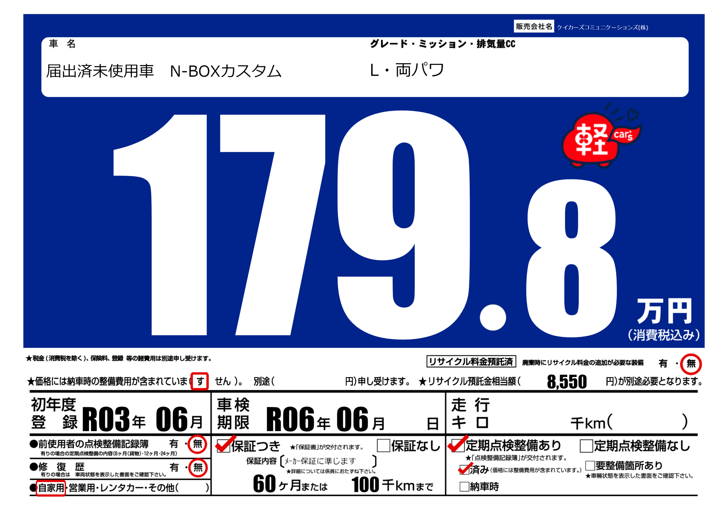 | 車名 | 届出済未使用車 N-BOXカスタム | グレード ミッション 排気量 |