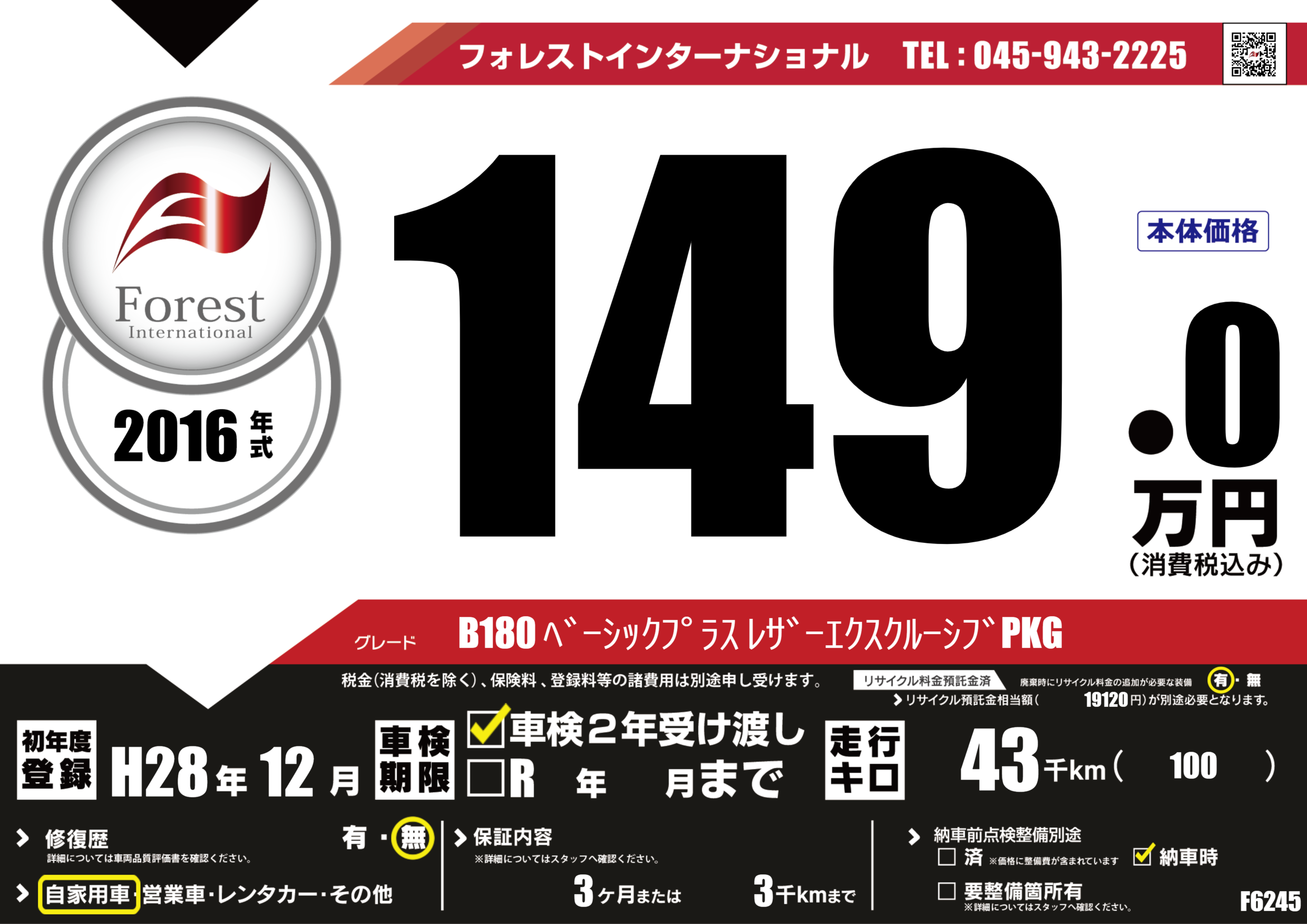 | 走行キロ | 4.3万km | 初年度登録 | H28年12月 |