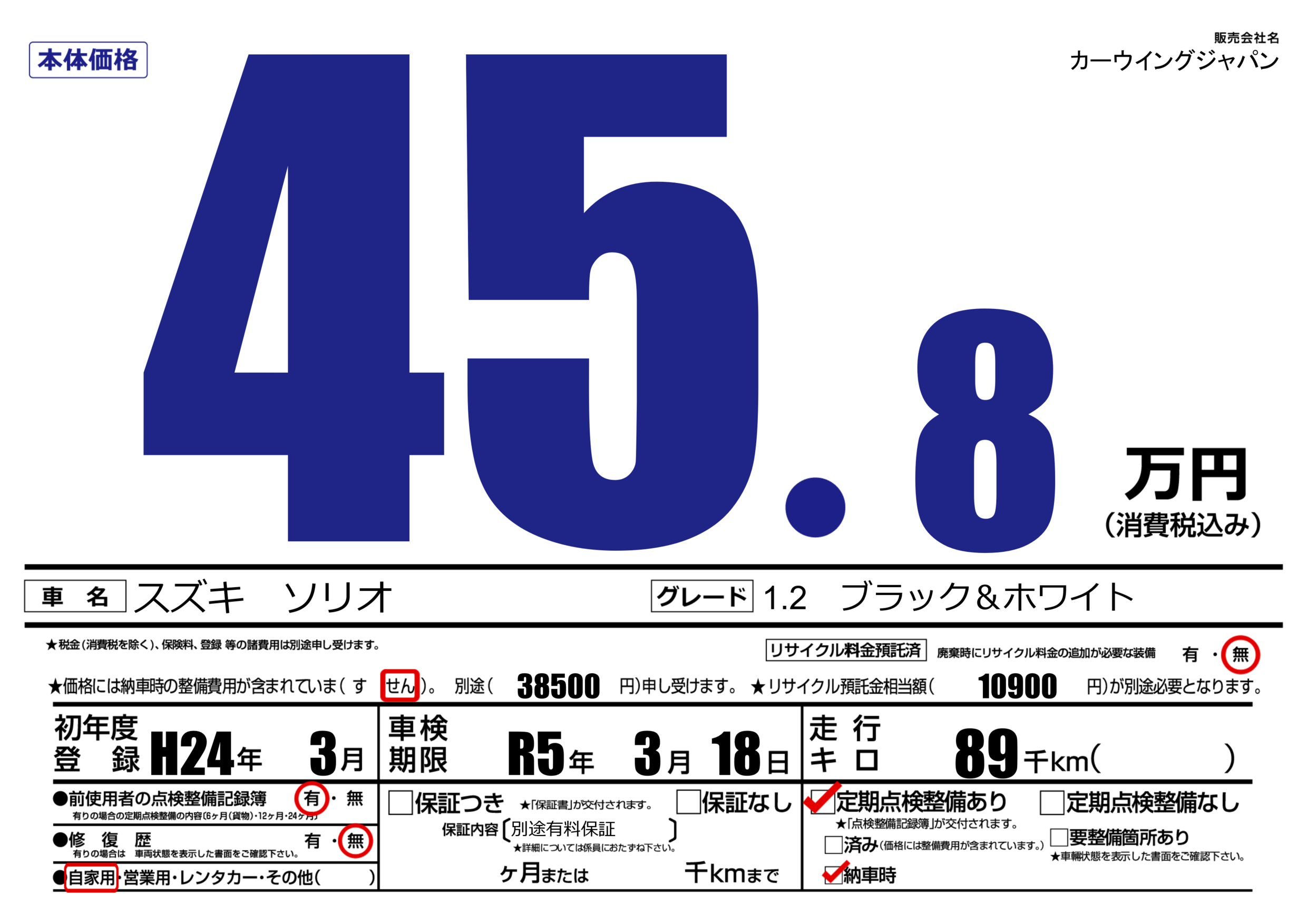 | 車名 | スズキ ソリオ | グレード ミッション 排気量 |