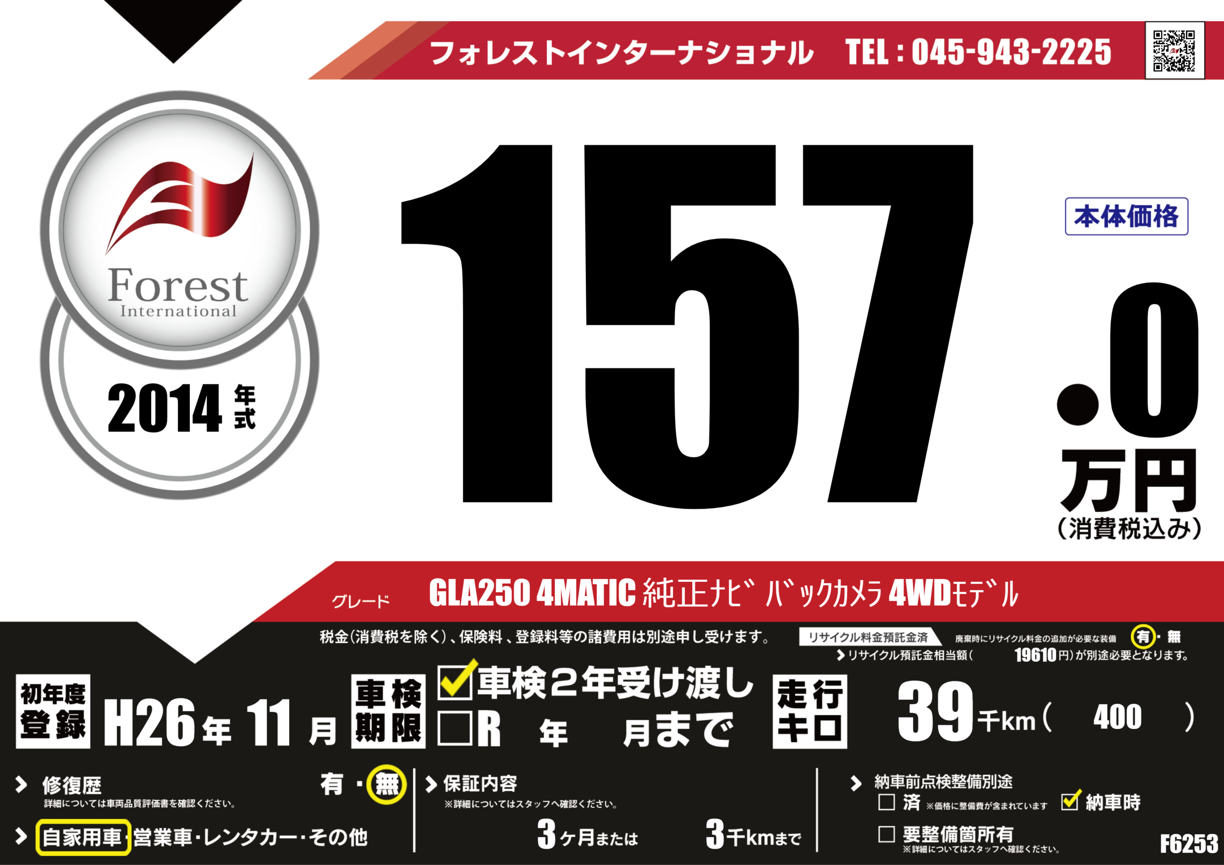 | 走行キロ | 3.9万km | 初年度登録 | H26年11月 |