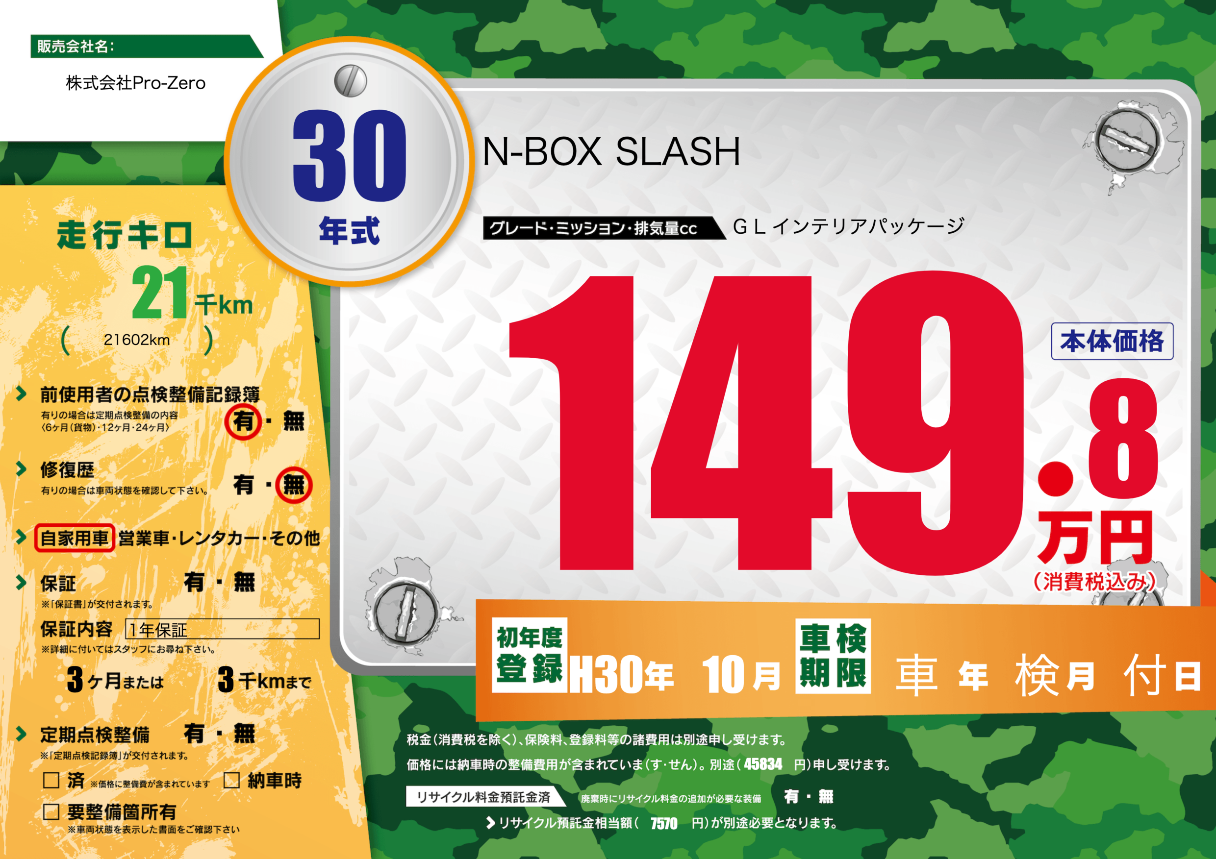 | 車名 | N-BOX SLASH | グレード ミッション 排気量 |