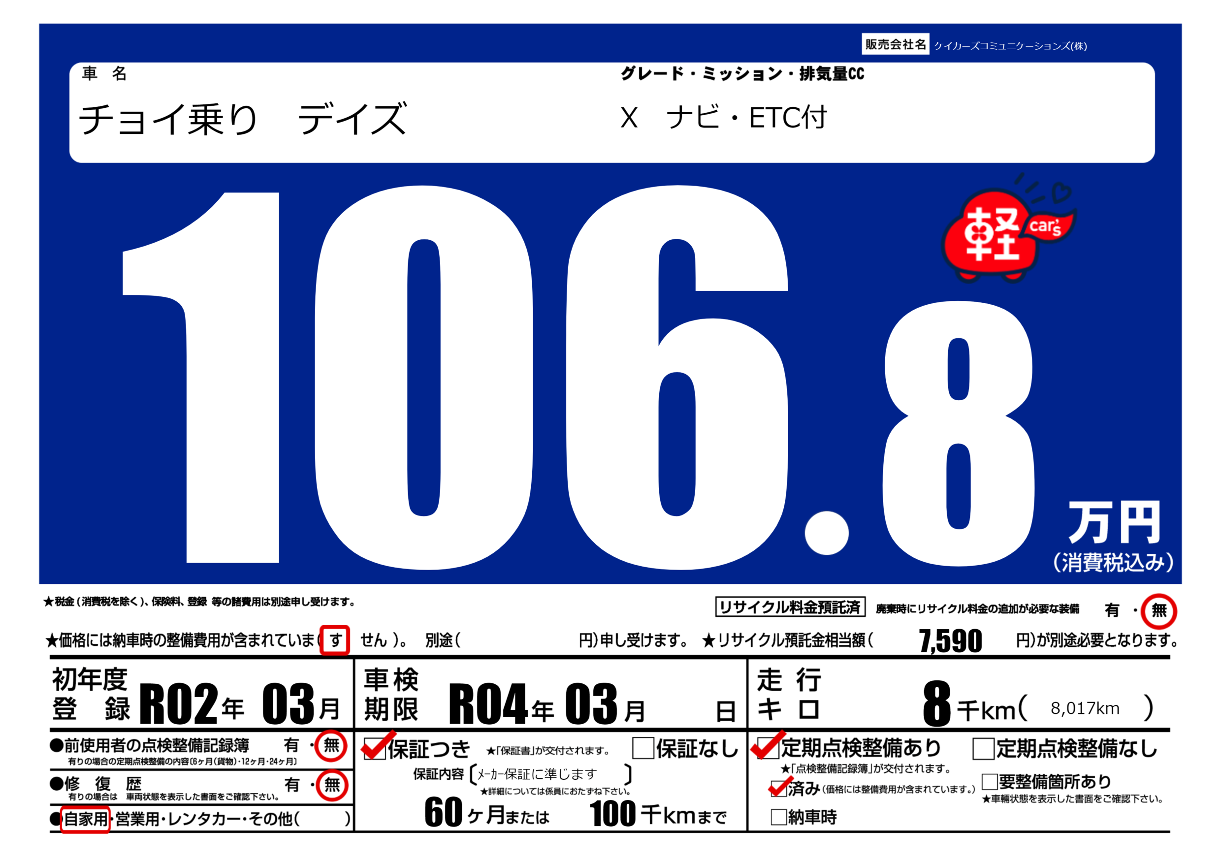 | 定期点検整備 | 定期点検整備あり 定期点検整備済み | ||