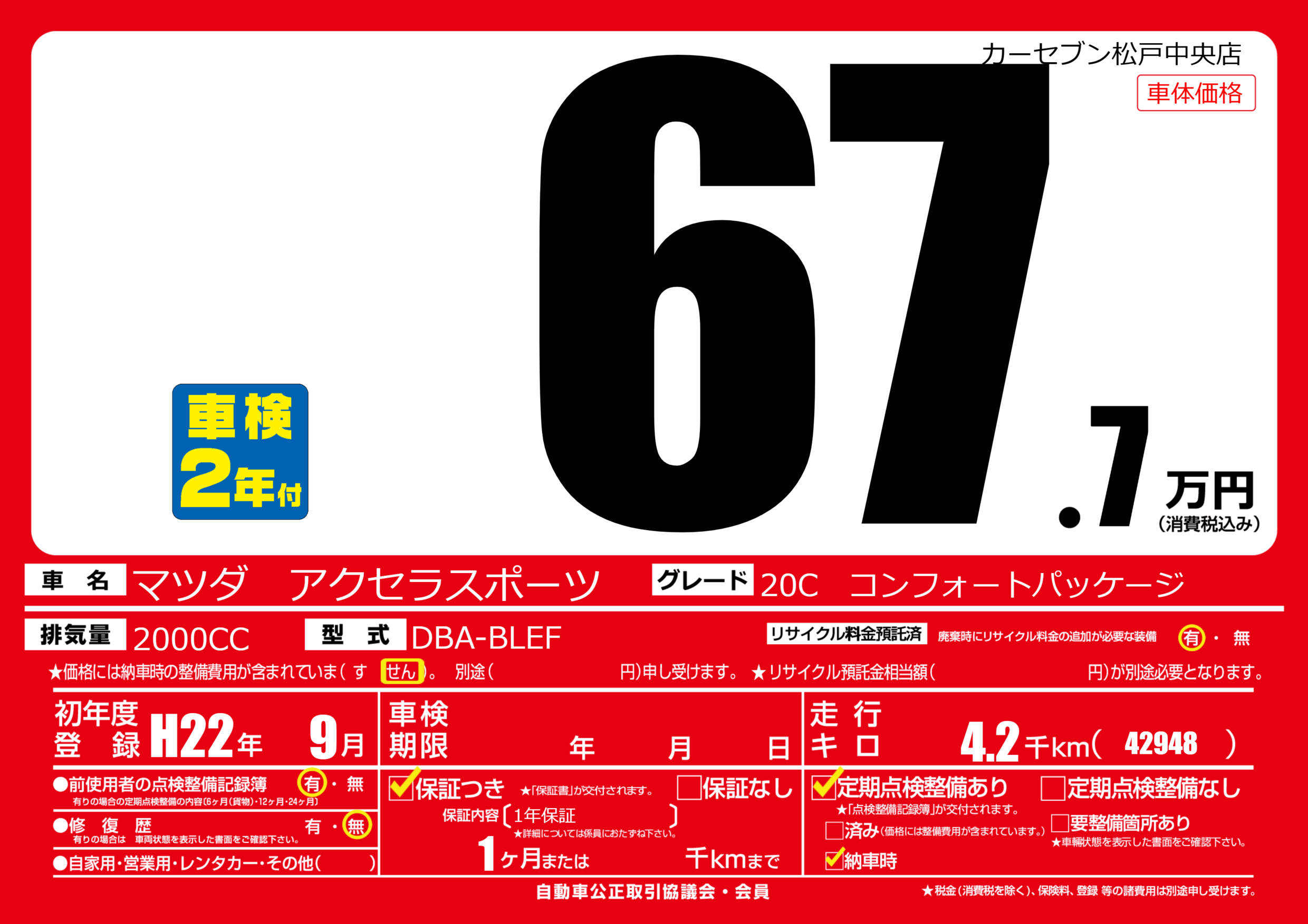 | 車名 | マツダ アクセラスポーツ | グレード ミッション 排気量 |