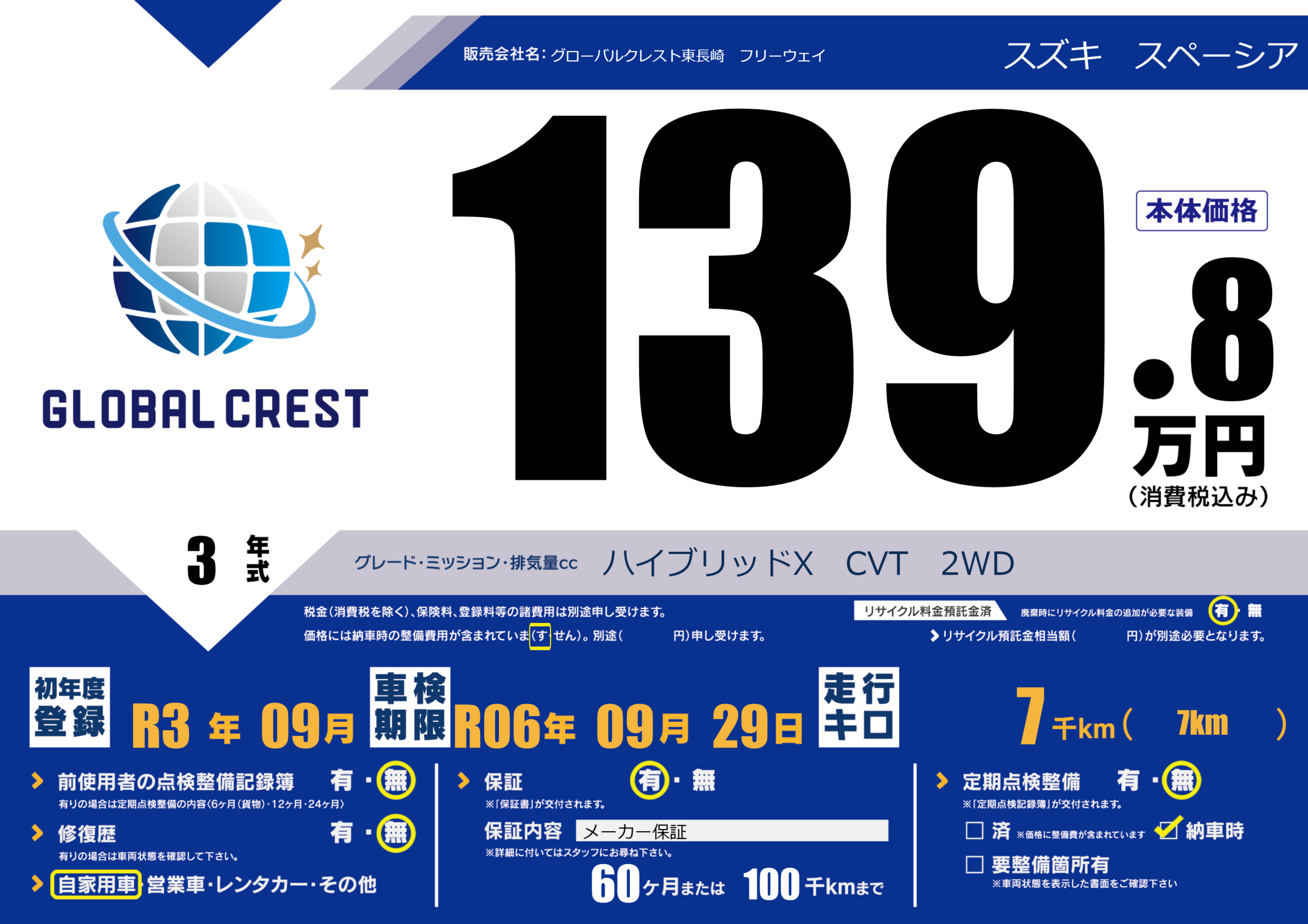 | 走行キロ | 0.7万km | 初年度登録 | R3年09月 |