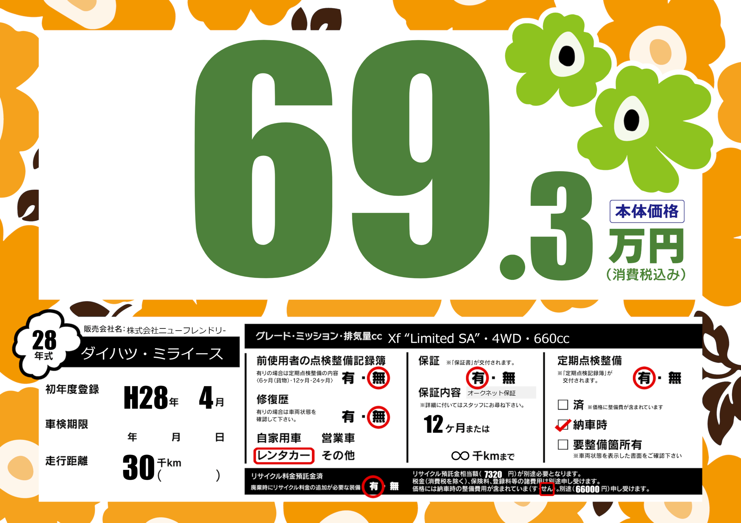 | 走行キロ | 3万km | 初年度登録 | H28年4月 |