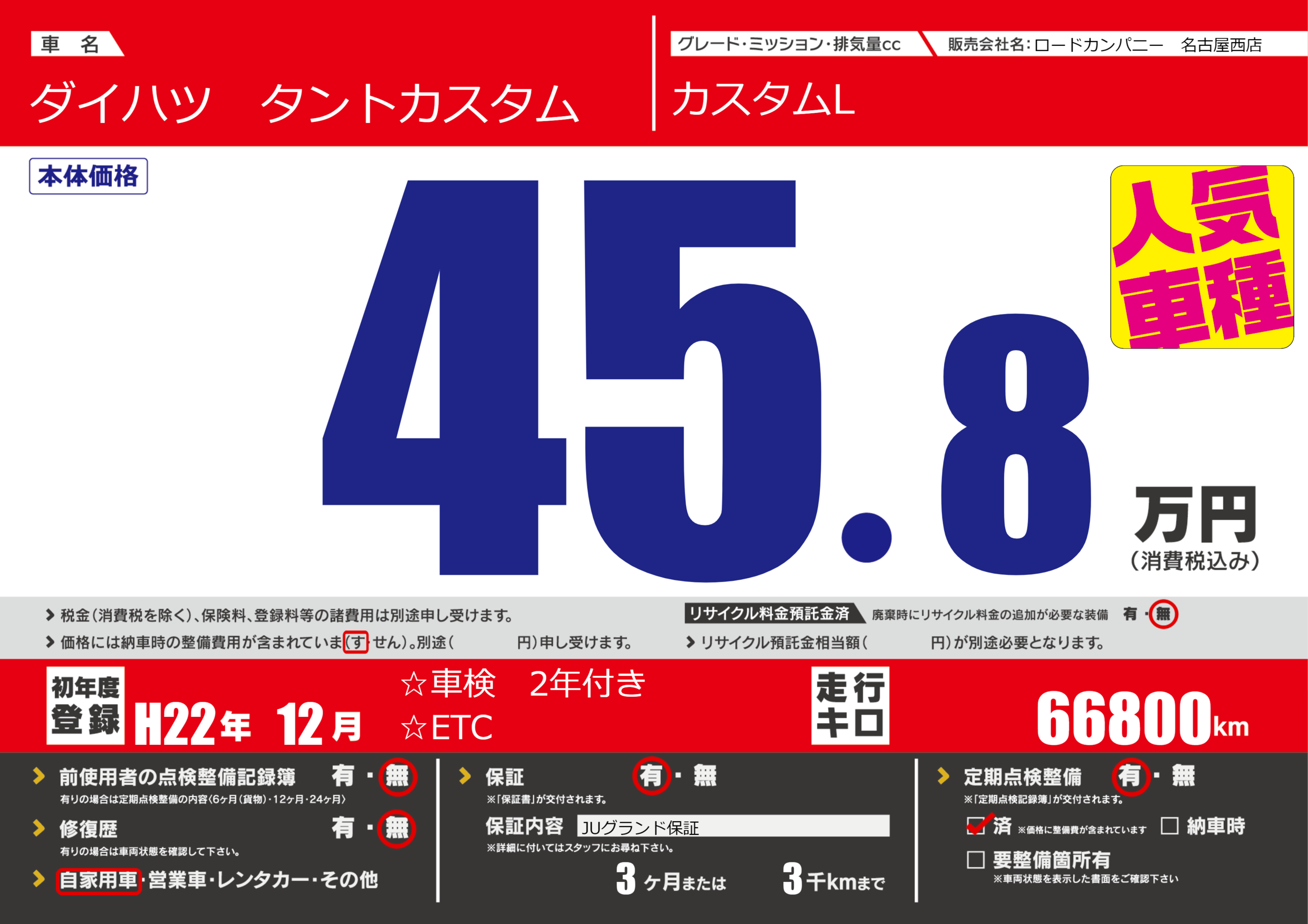 | 定期点検整備 | 定期点検整備あり 定期点検整備済み | ||