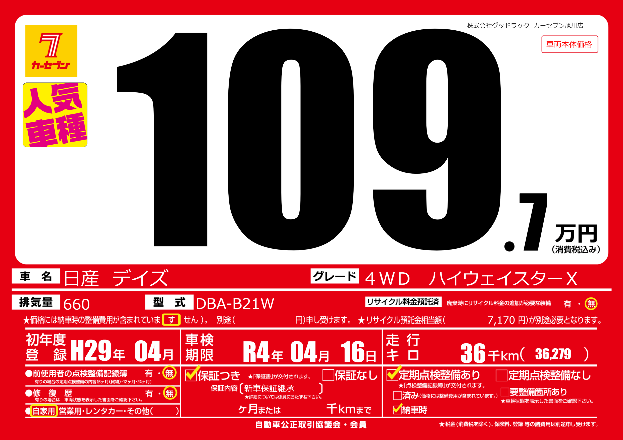 | 車名 | 日産 デイズ | グレード ミッション 排気量 |