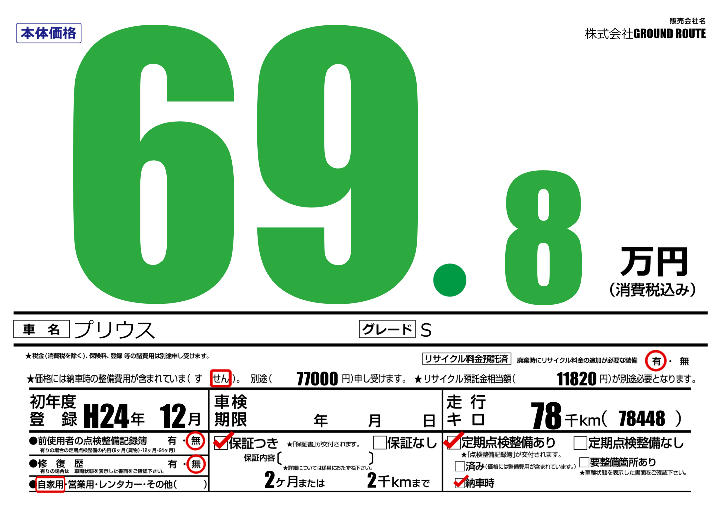 | 車名 | プリウス | グレード ミッション 排気量 |
