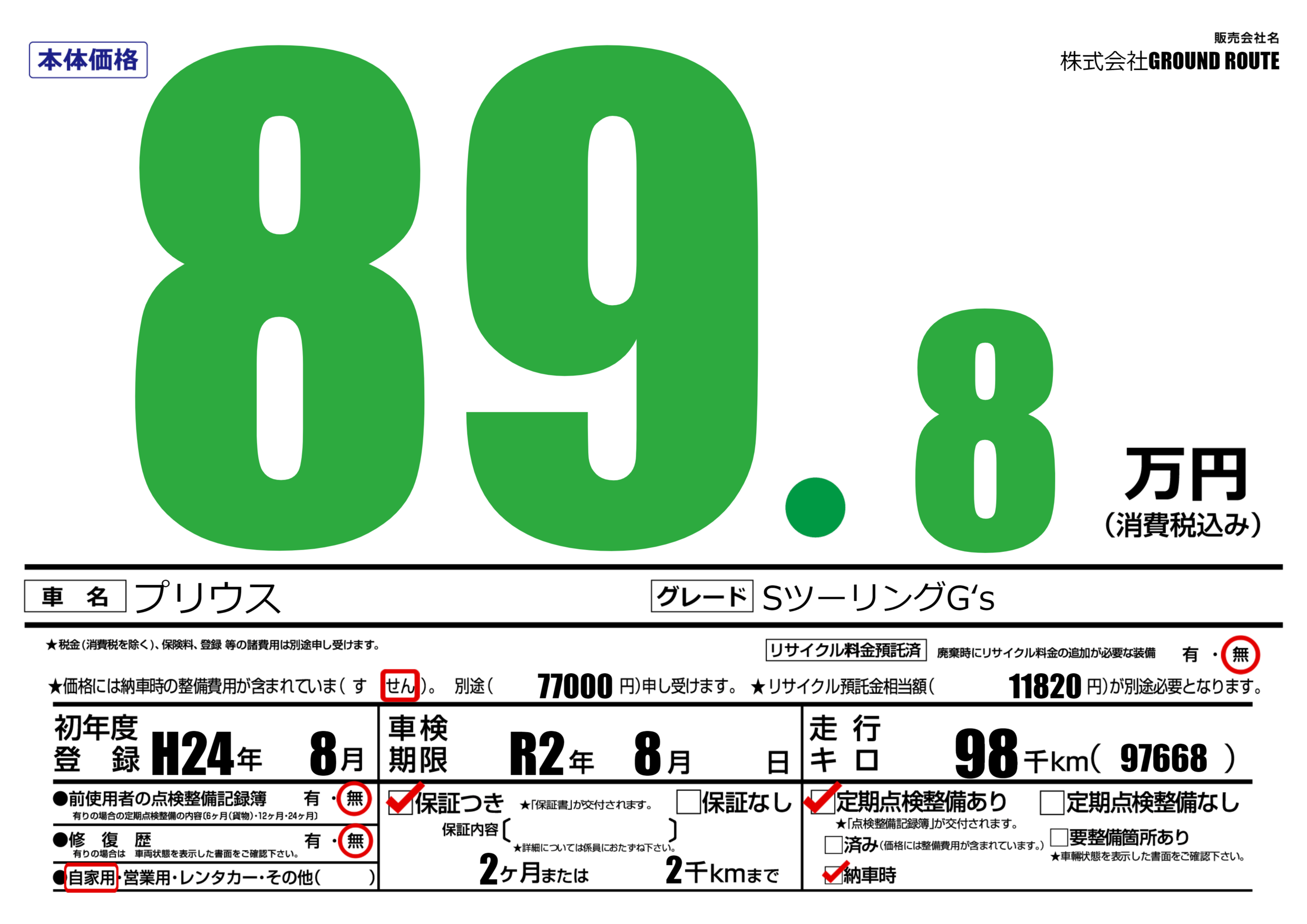 車検制限 | R2年8月---月 |