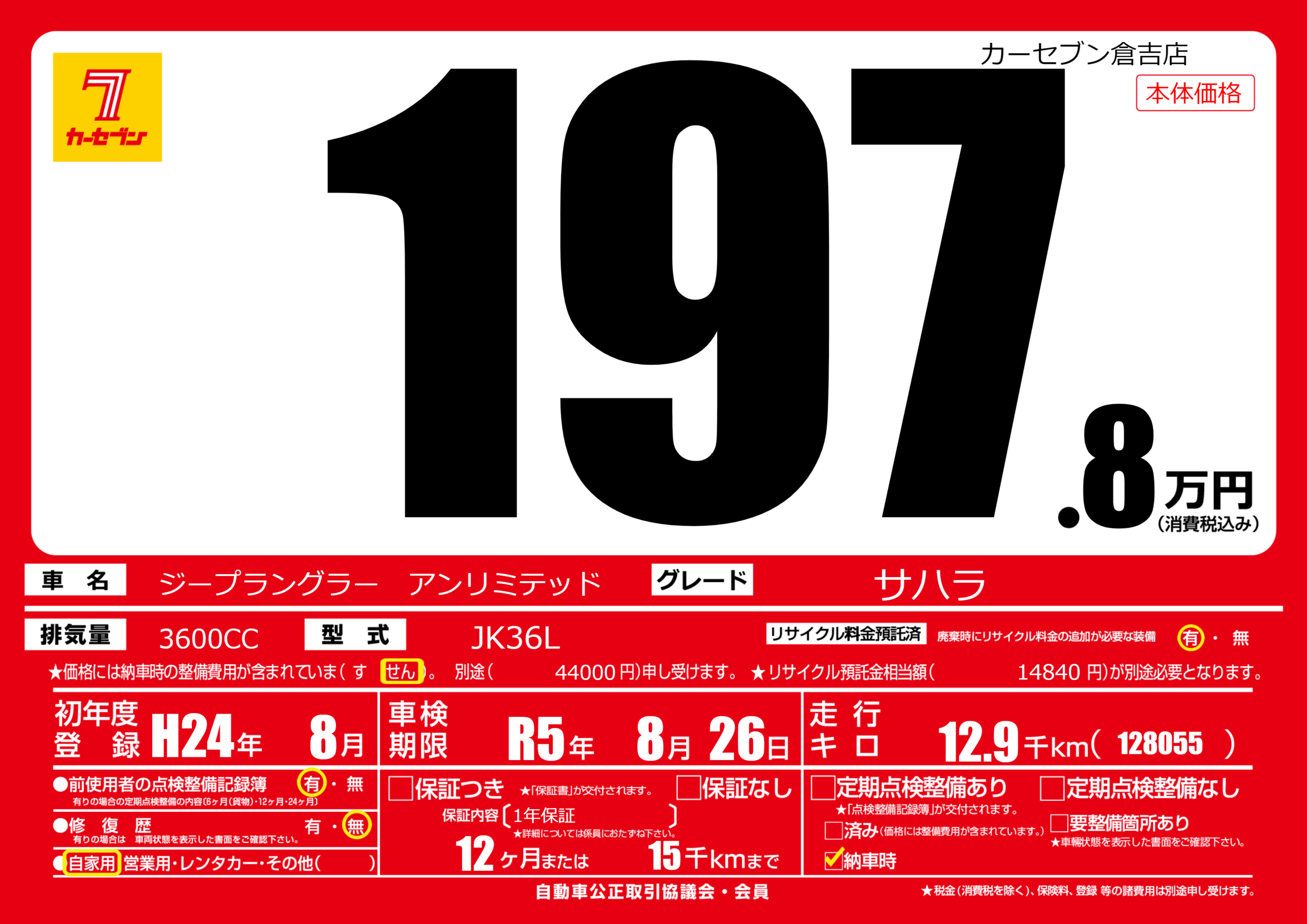 | 走行キロ | 1.2万km | 初年度登録 | H24年8月 |