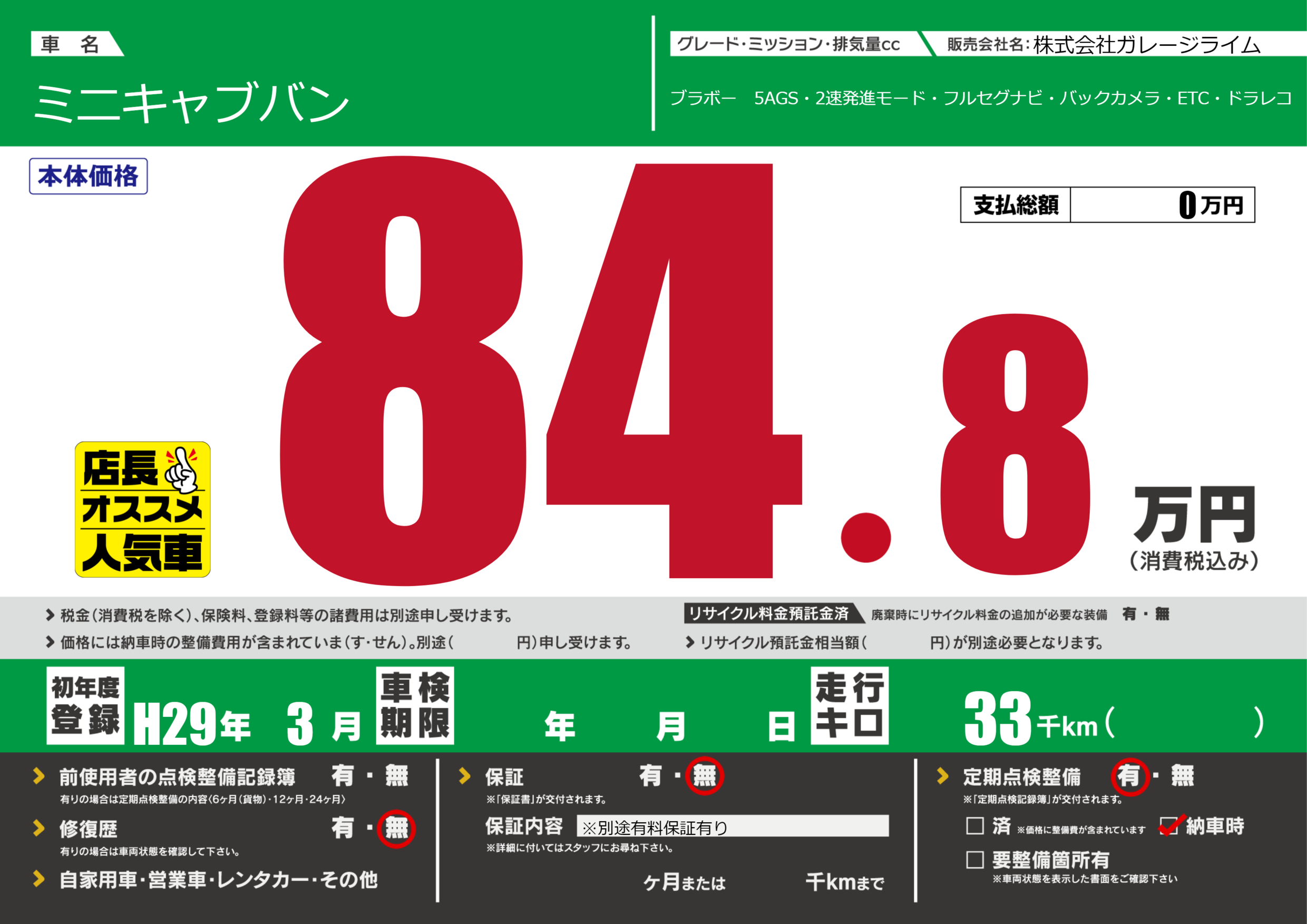 | 車名 | ミニキャブバン | グレード ミッション 排気量 |