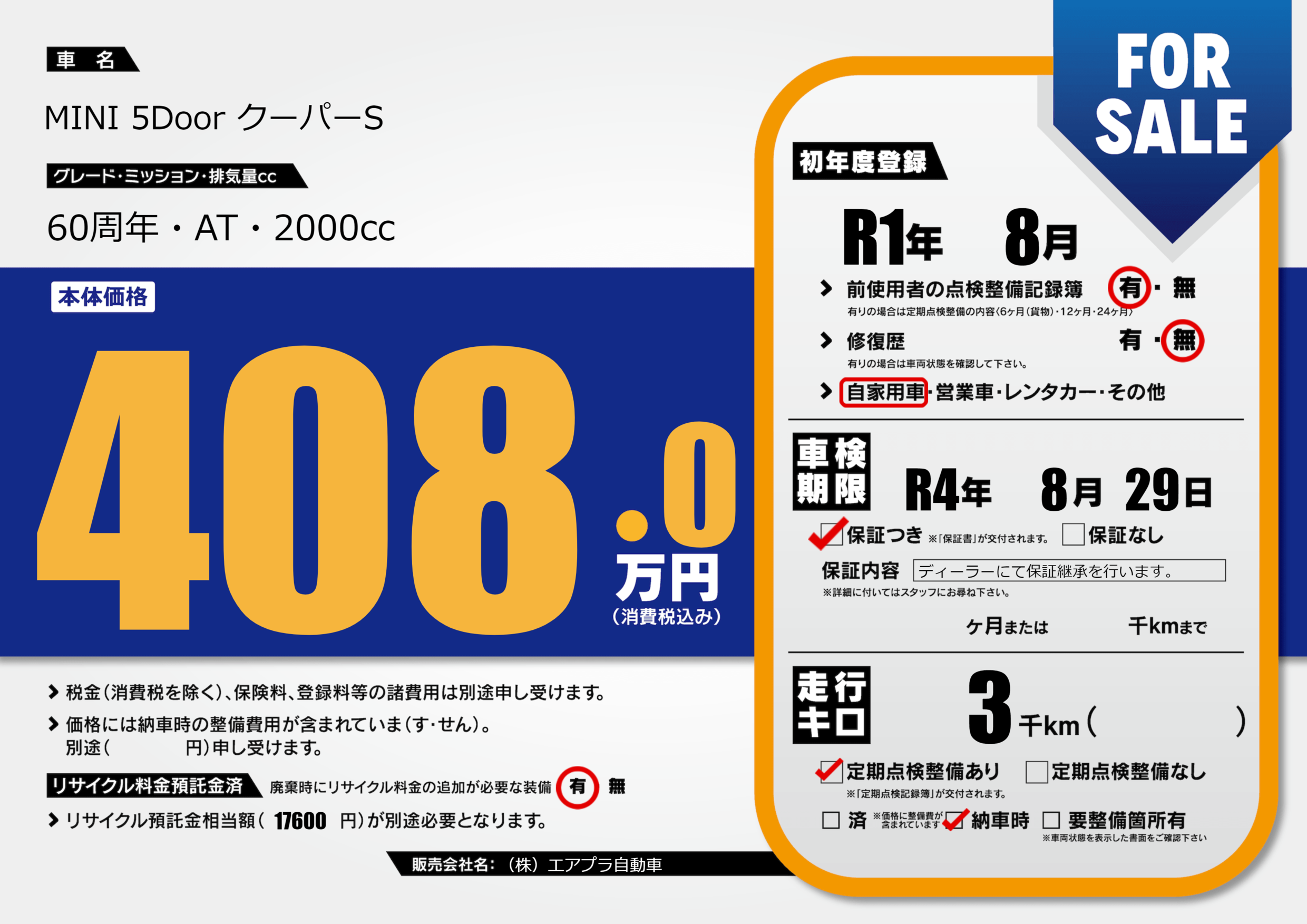 保証付き 保証内容(ディーラーにて保証継承を行います。) ---ヶ月または()千kmまで |