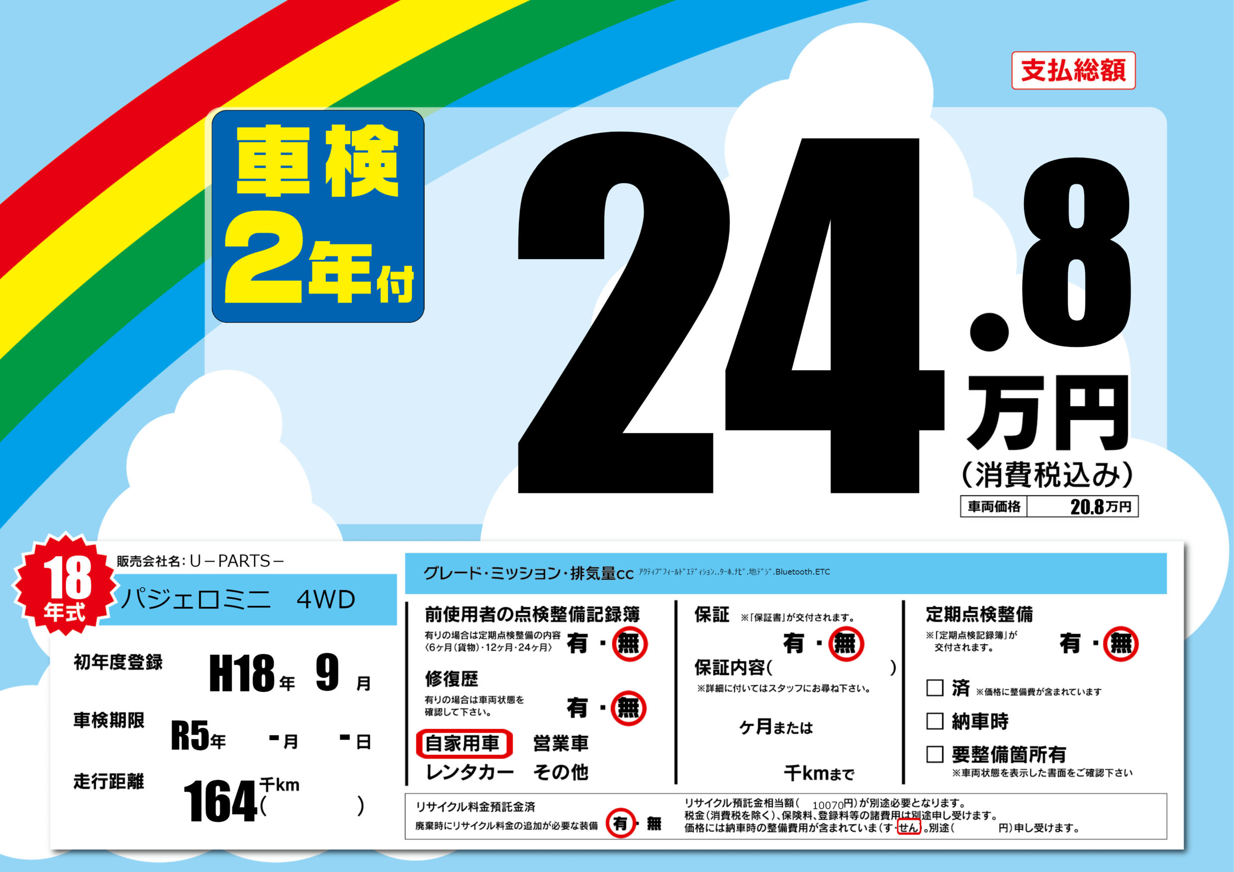 | 車名 | パジェロミニ 4WD | グレード ミッション 排気量 |