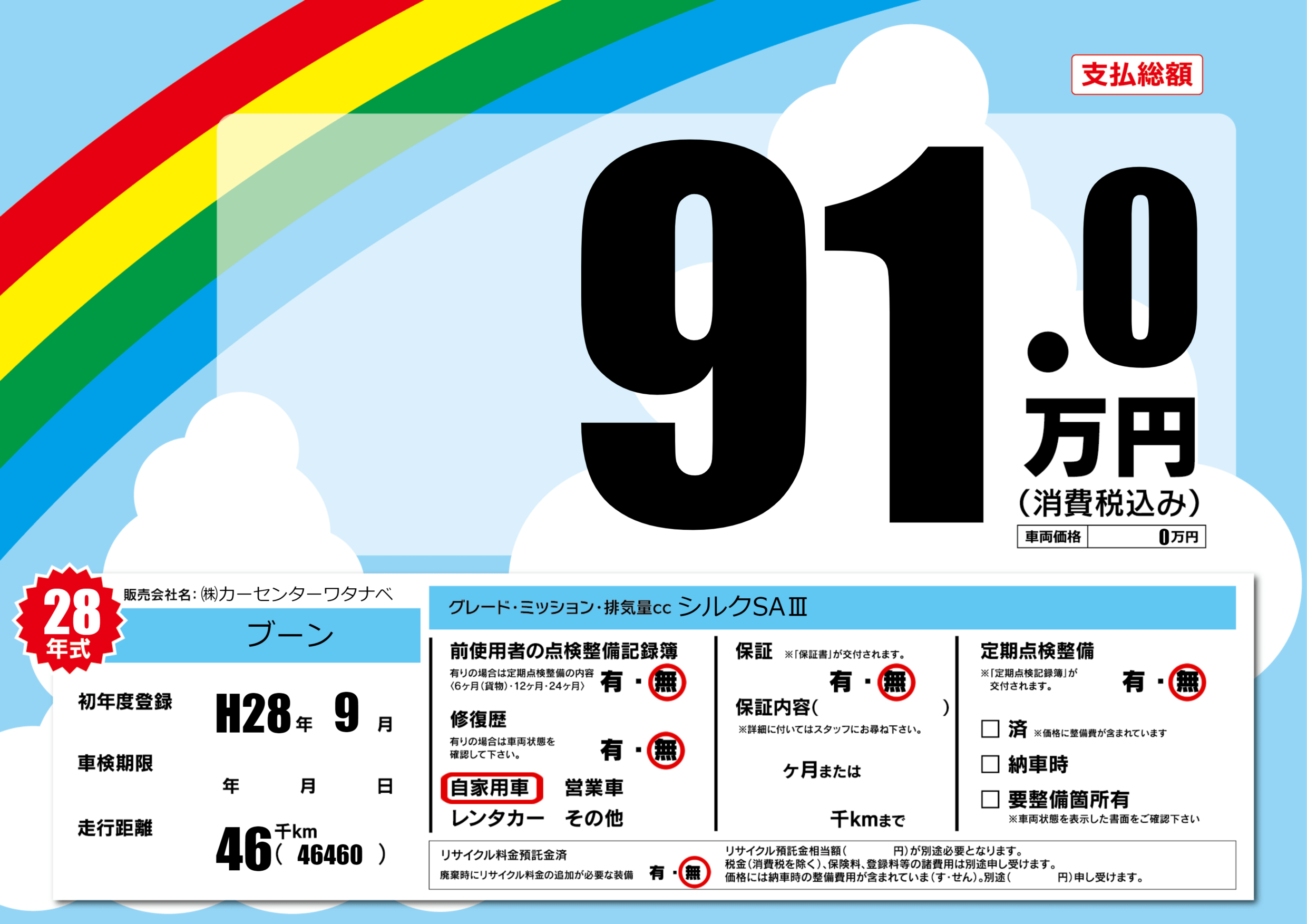 | 走行キロ | 4.6万km | 初年度登録 | H28年9月 |
