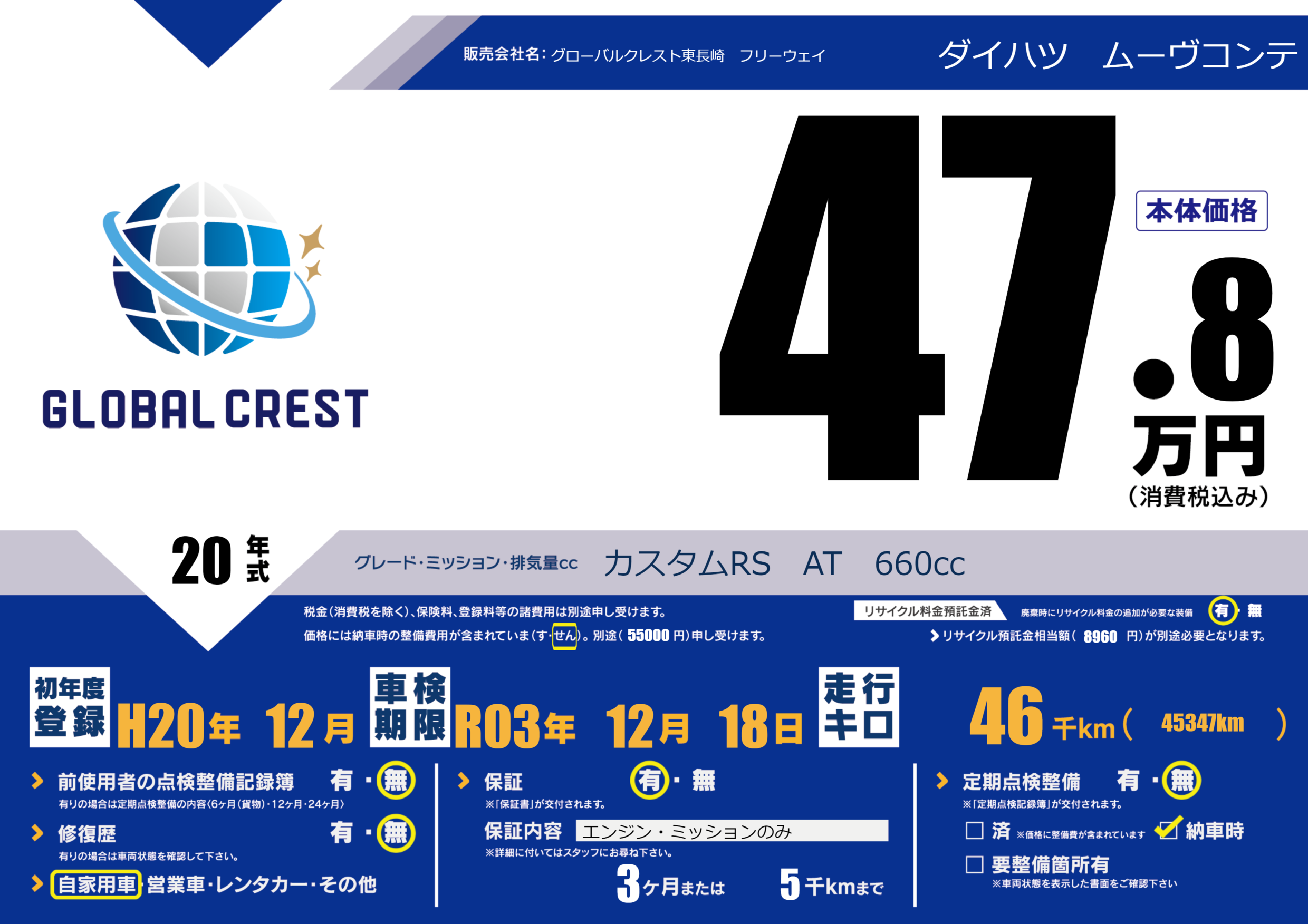 | 車名 | ダイハツ ムーヴコンテ | グレード ミッション 排気量 |