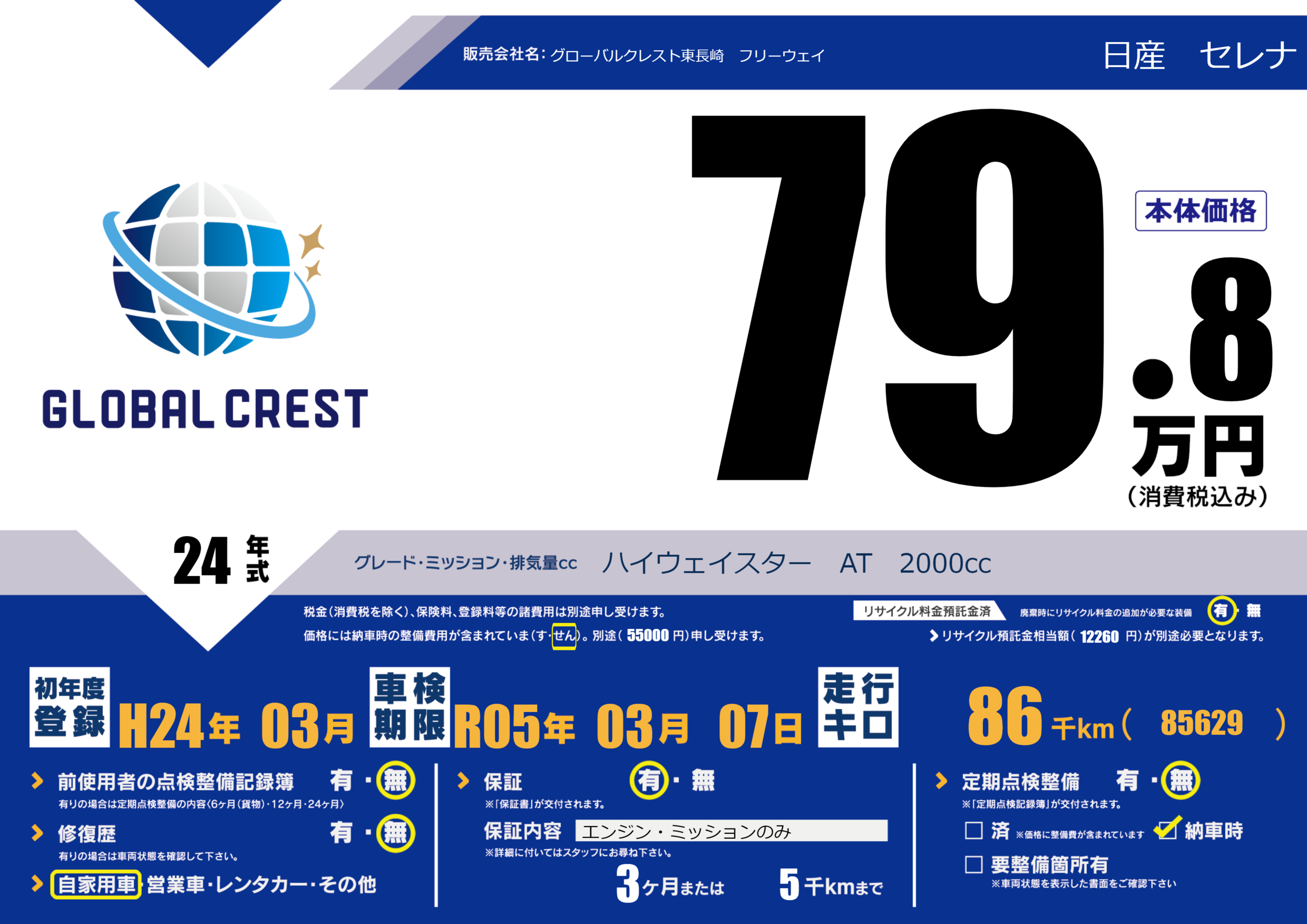 | 車名 | 日産 セレナ | グレード ミッション 排気量 |