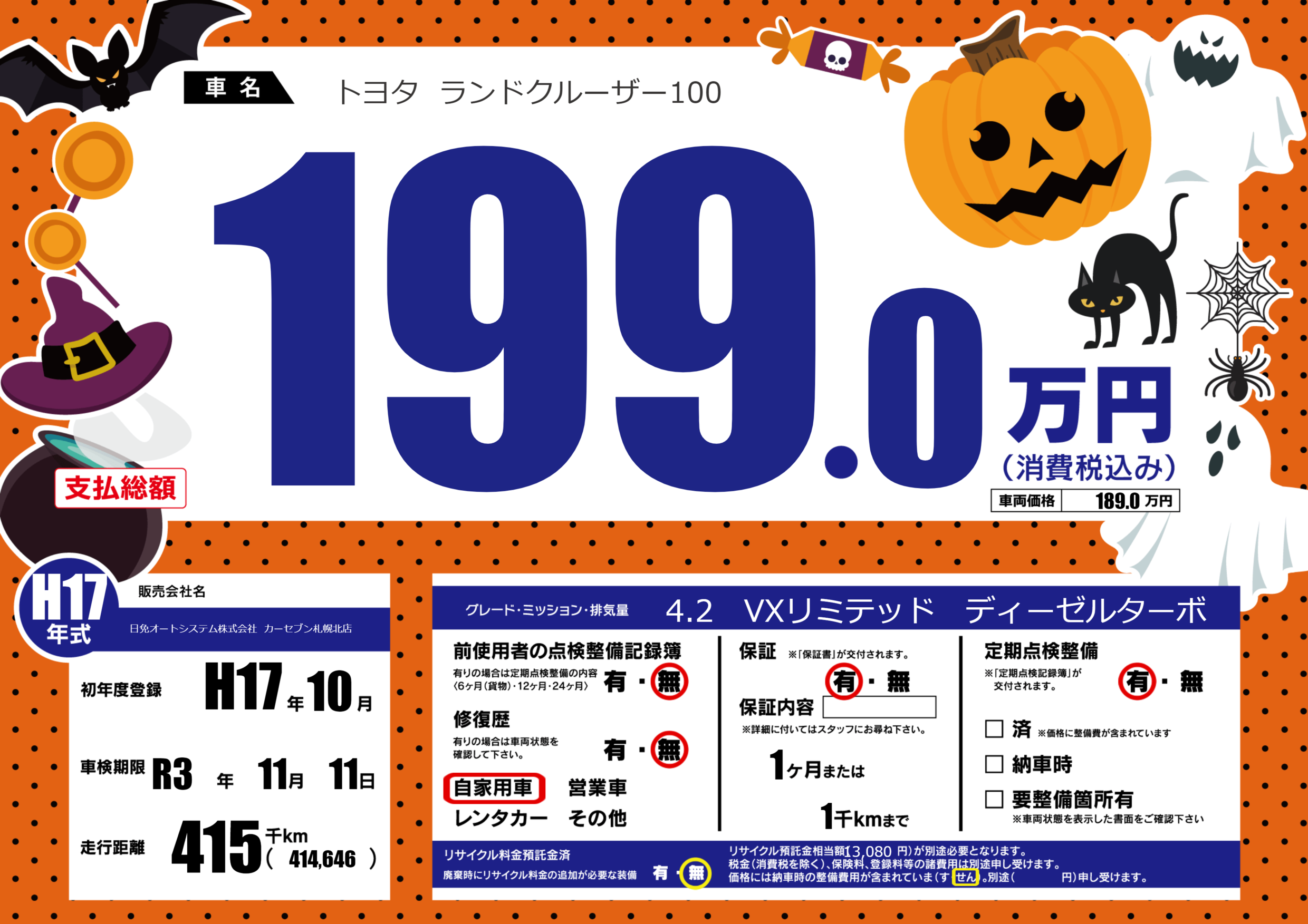 | 走行キロ | 41.5万km | 初年度登録 | H17年10月 |