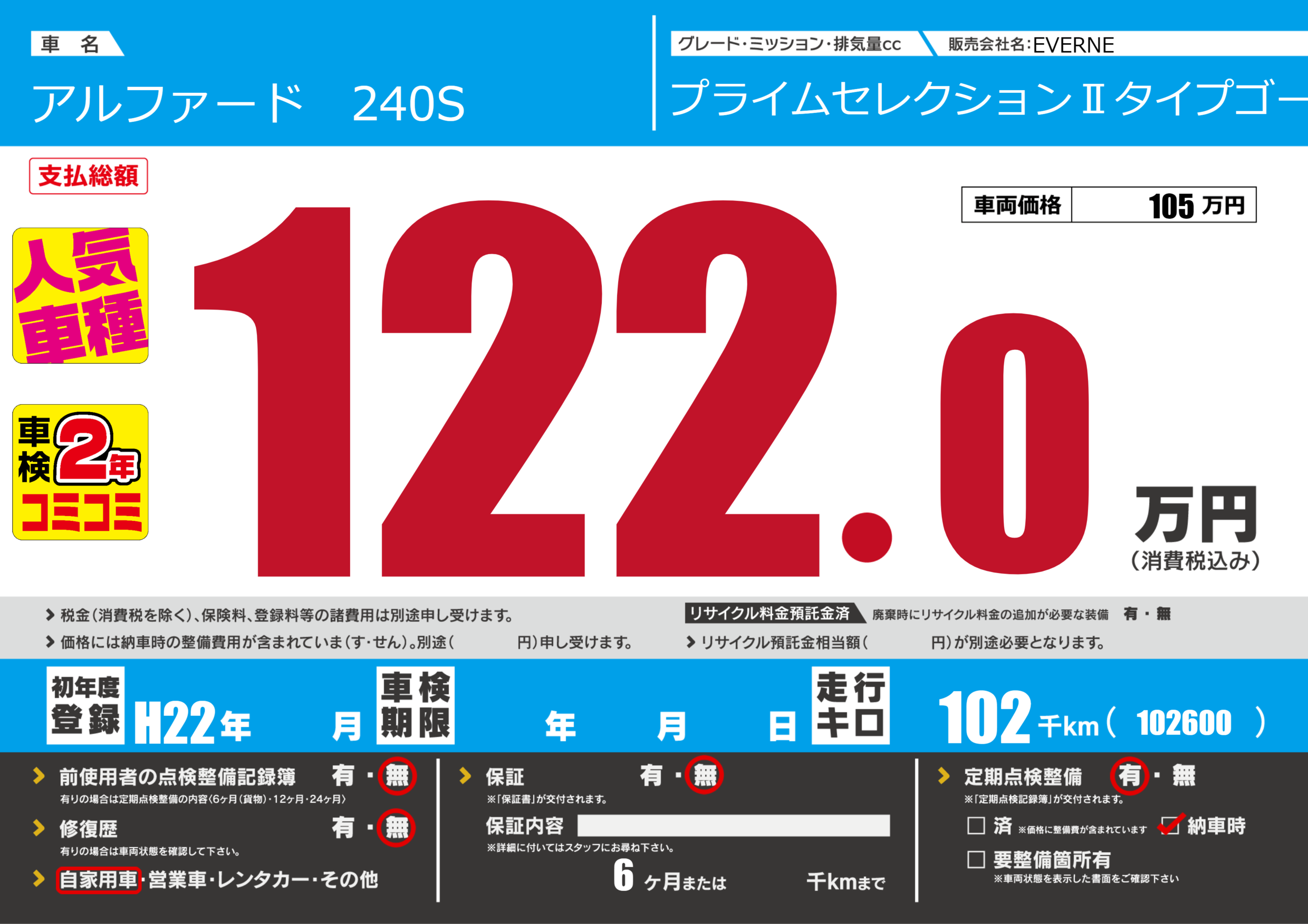 | 車名 | アルファード 240S | グレード ミッション 排気量 |