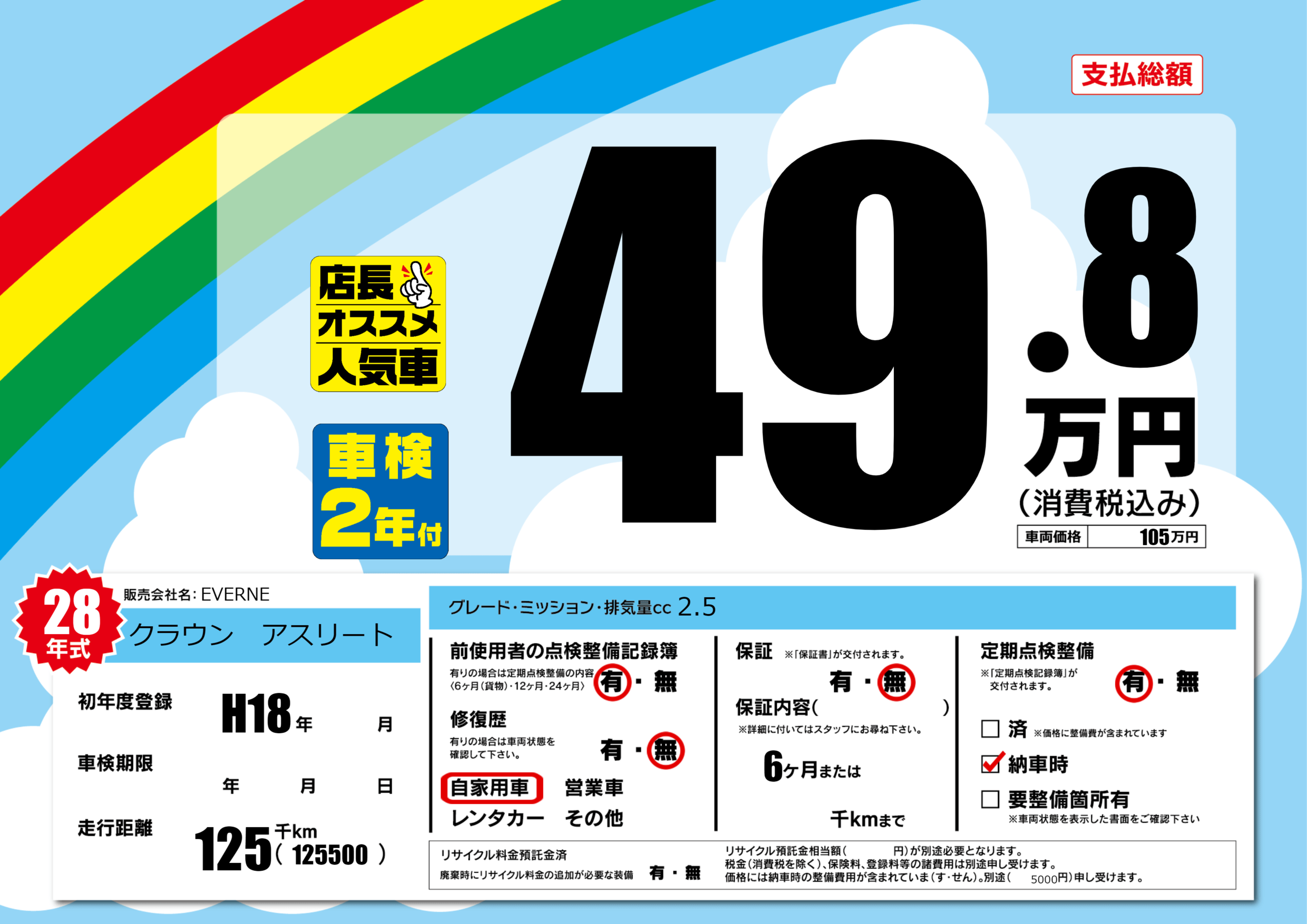 | 定期点検整備 | 定期点検整備あり 納車時あり | ||