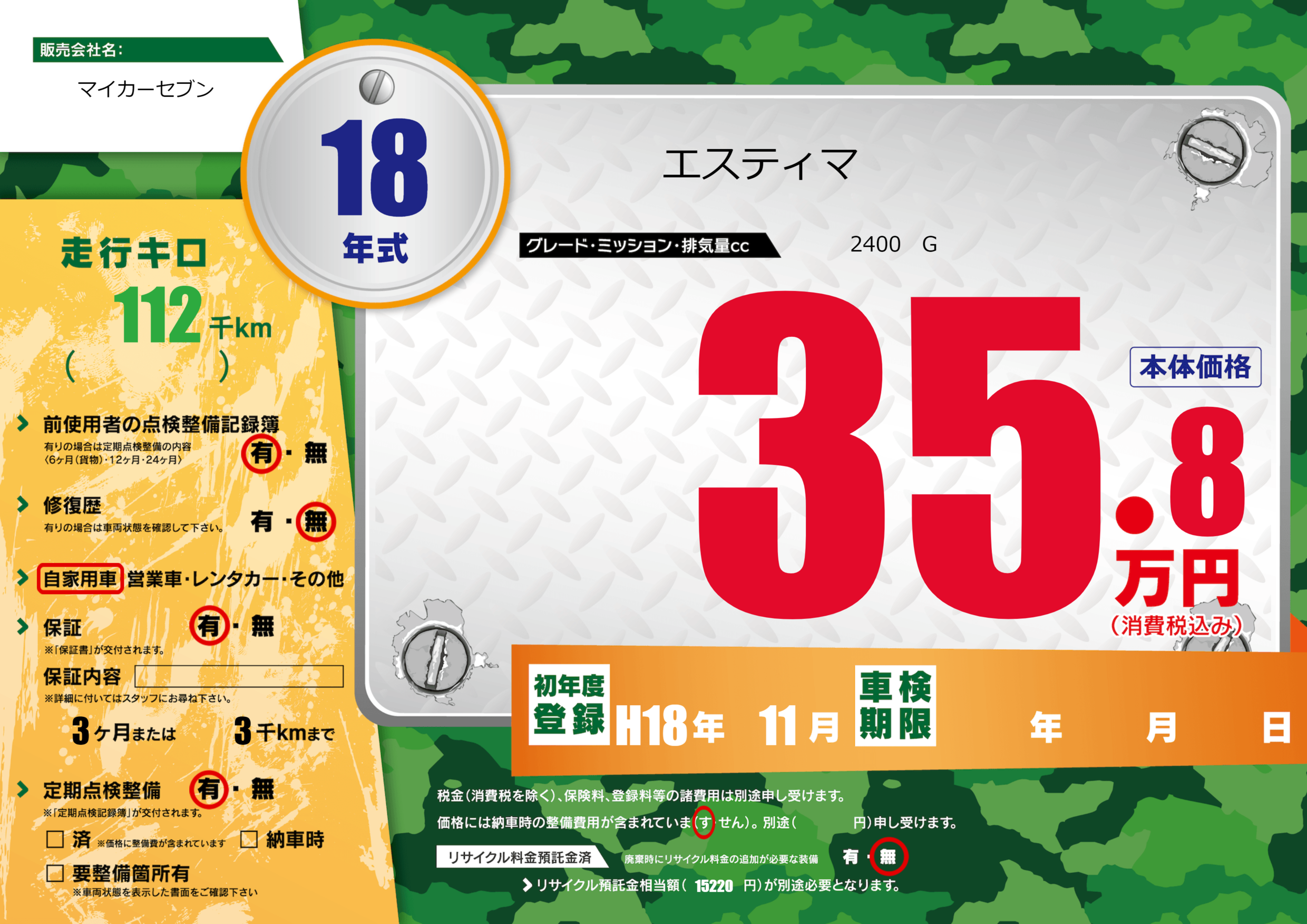 | 走行キロ | 11.2万km | 初年度登録 | H18年11月 |