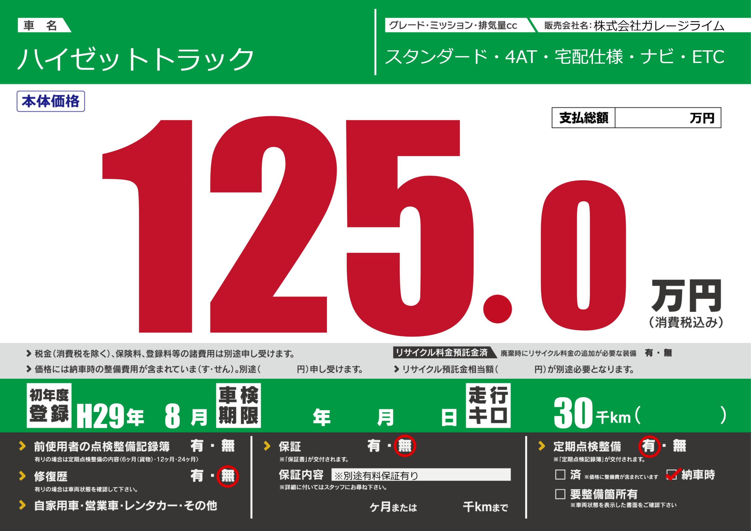 | 定期点検整備 | 定期点検整備あり 納車時あり | ||
