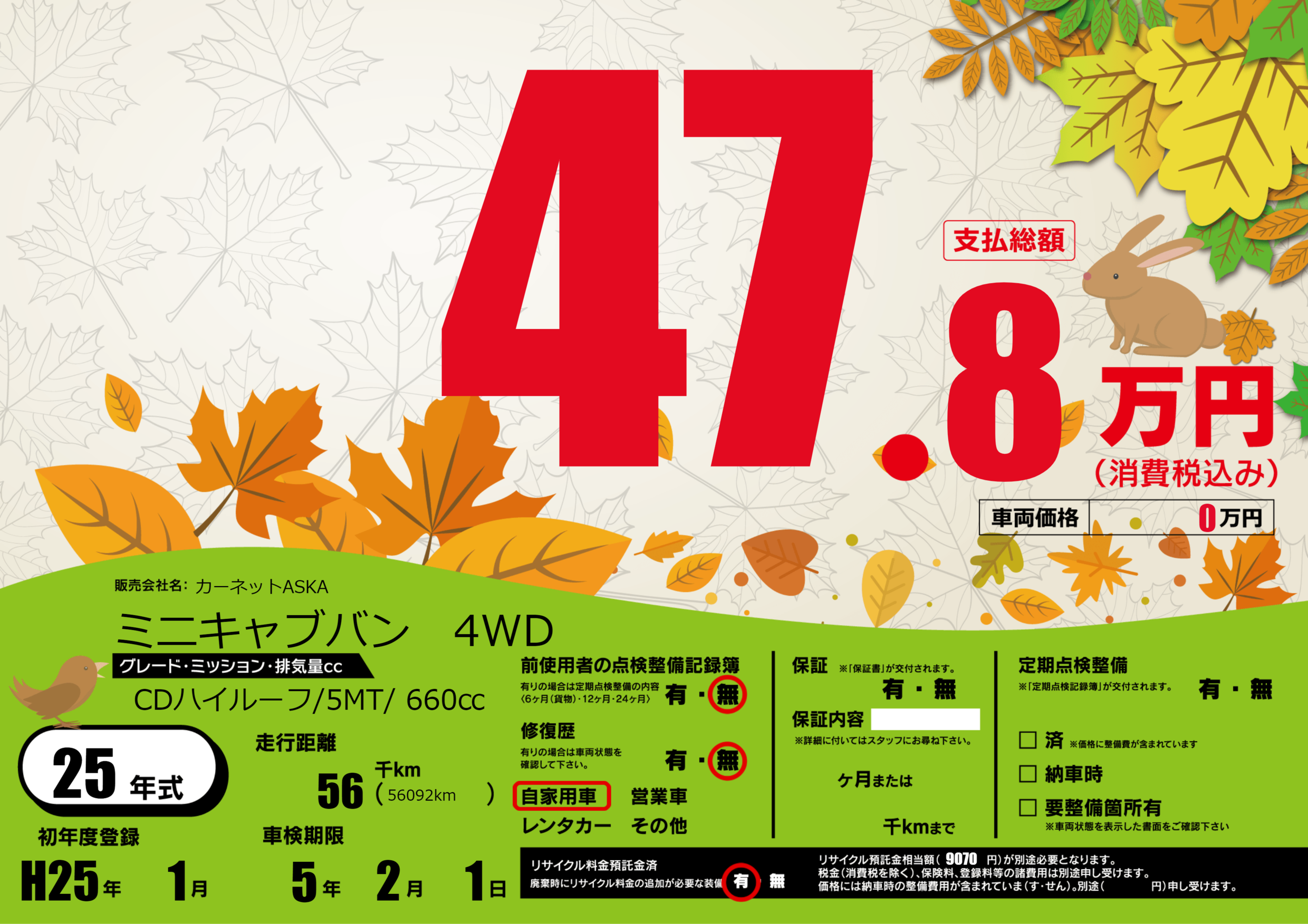 | 車名 | ミニキャブバン 4WD | グレード ミッション 排気量 |