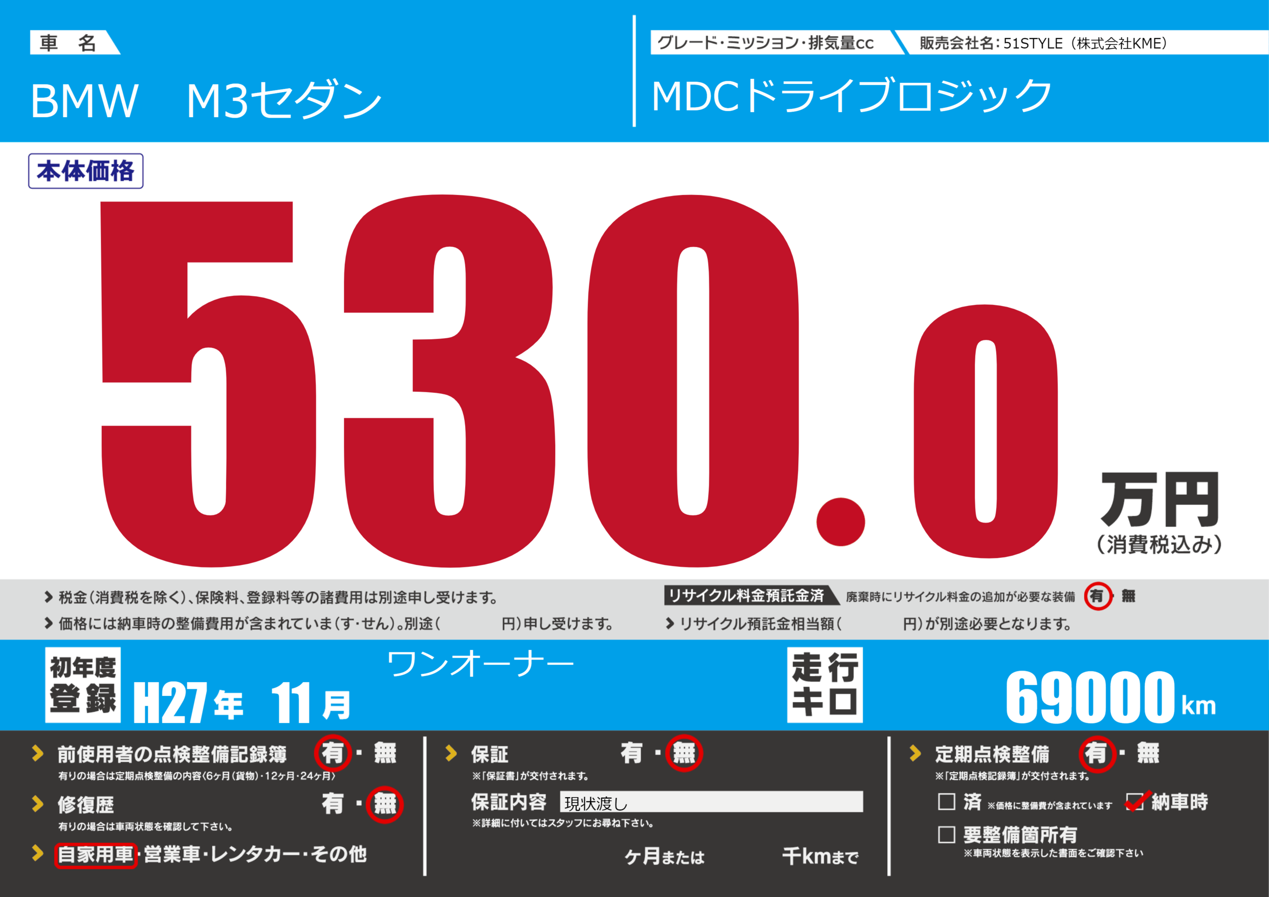 | 車名 | BMW M3セダン | グレード ミッション 排気量 |
