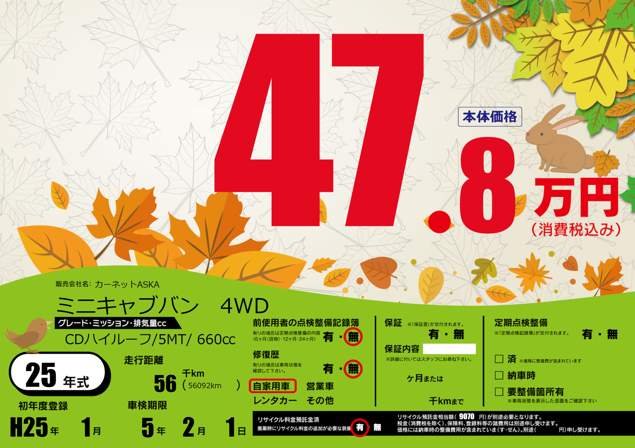 | 車名 | ミニキャブバン 4WD | グレード ミッション 排気量 |