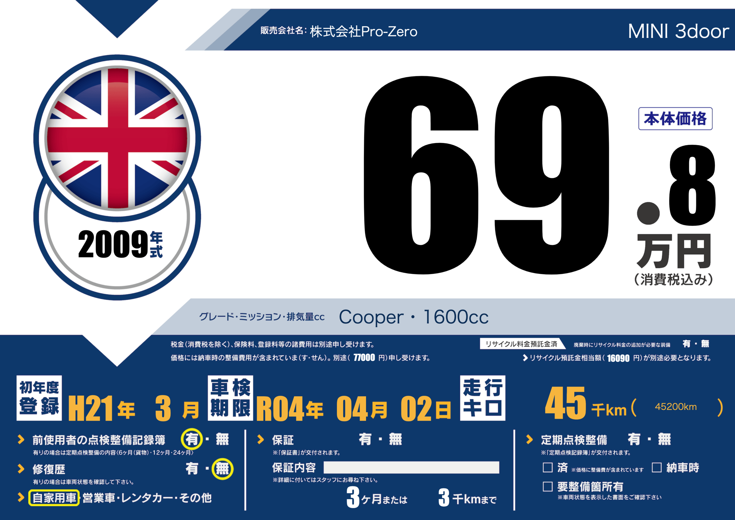 | 車名 | MINI 3door | グレード ミッション 排気量 |